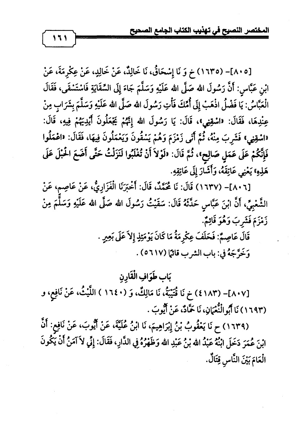[805]- (1635) خ وَنَا إِسْحَاقُ، نَا خَالِدٌ، عَنْ خَالِدٍ، عَنْ عِكْرِمَةَ، عَنْ ابْنِ عَبَّاسٍ: أَنَّ رَسُولَ الله صَلَّى الله عَلَيْهِ وَسَلَّمَ جَاءَ إِلَى السِّقَايَةِ فَاسْتَسْقَى, فَقَالَ الْعَبَّاسُ: يَا فَضْلُ اذْهَبْ إِلَى أُمِّكَ فَأْتِ رَسُولَ الله صَلَّى الله عَلَيْهِ وَسَلَّمَ بِشَرَابٍ مِنْ عِنْدِهَا, فَقَالَ: «اسْقِنِي» , قَالَ: يَا رَسُولَ الله إِنَّهُمْ يَجْعَلُونَ أَيْدِيَهُمْ فِيهِ, قَالَ: «اسْقِنِي» فَشَرِبَ مِنْهُ, ثُمَّ أَتَى زَمْزَمَ وَهُمْ يَسْقُونَ وَيَعْمَلُونَ فِيهَا, فَقَالَ: «اعْمَلُوا فَإِنَّكُمْ عَلَى عَمَلٍ صَالِحٍ»، ثُمَّ قَالَ: «لَوْلاَ أَنْ تُغْلَبُوا لَنَزَلْتُ حَتَّى أَضَعَ الْحَبْلَ عَلَى هَذِهِ» يَعْنِي عَاتِقَهُ, وَأَشَارَ إِلَى عَاتِقِهِ.