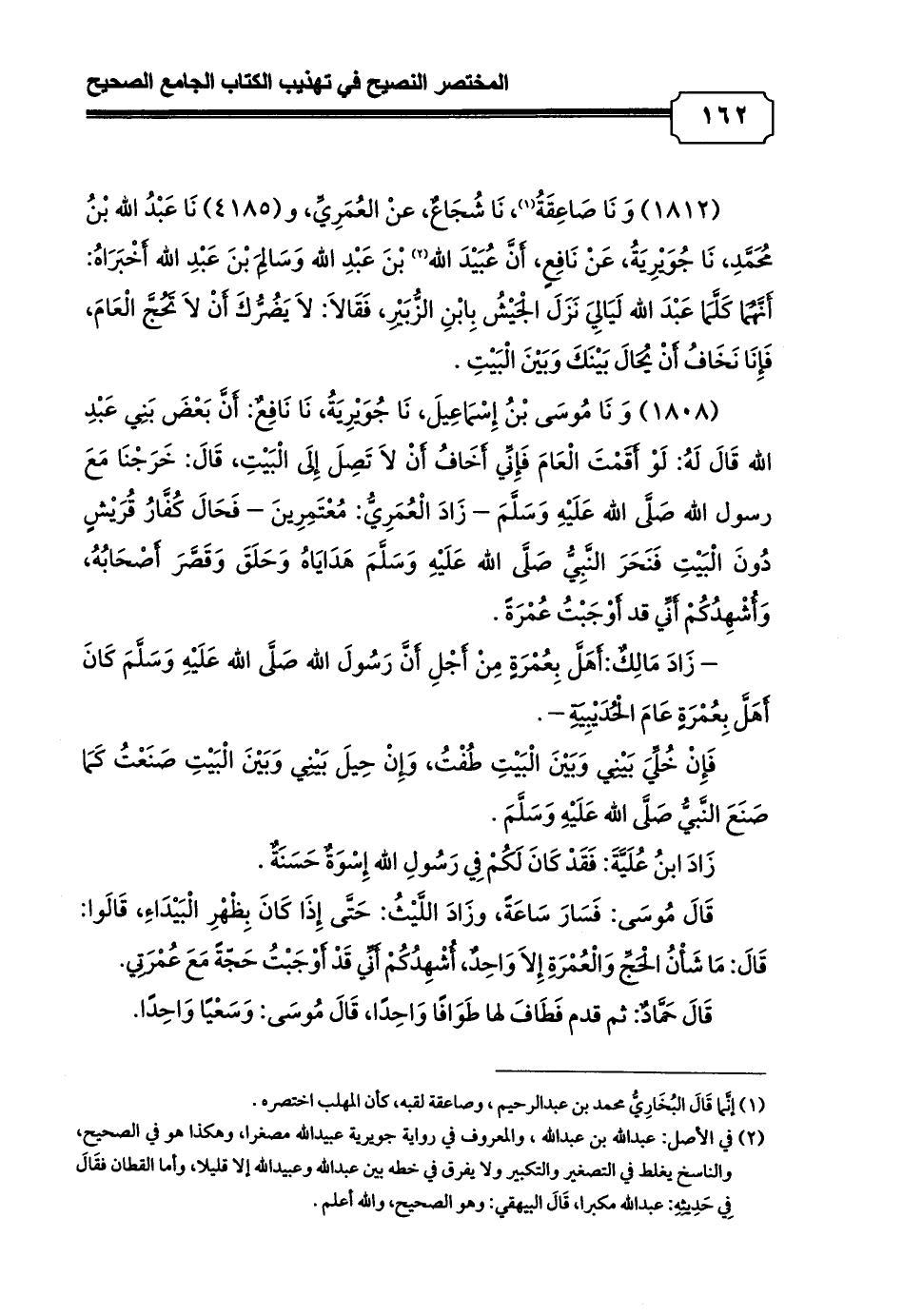 (1808) وَنَا مُوسَى بْنُ إِسْمَاعِيلَ، نَا جُوَيْرِيَةُ، نَا نَافِعٌ: أَنَّ بَعْضَ بَنِي عَبْدِ الله قَالَ لَهُ: لَوْ أَقَمْتَ الْعَامَ فَإِنِّي أَخَافُ أَنْ لاَ تَصِلَ إِلَى الْبَيْتِ, قَالَ: خَرَجْنَا مَعَ رسول الله صَلَّى الله عَلَيْهِ وَسَلَّمَ - زَادَ الْعُمَرِيُّ: مُعْتَمِرِينَ - فَحَالَ كُفَّارُ قُرَيْشٍ دُونَ الْبَيْتِ فَنَحَرَ النَّبِيُّ صَلَّى الله عَلَيْهِ وَسَلَّمَ هَدَايَاهُ وَحَلَقَ وَقَصَّرَ أَصْحَابُهُ, وَأُشْهِدُكُمْ أَنِّي قد أَوْجَبْتُ عُمْرَةً.