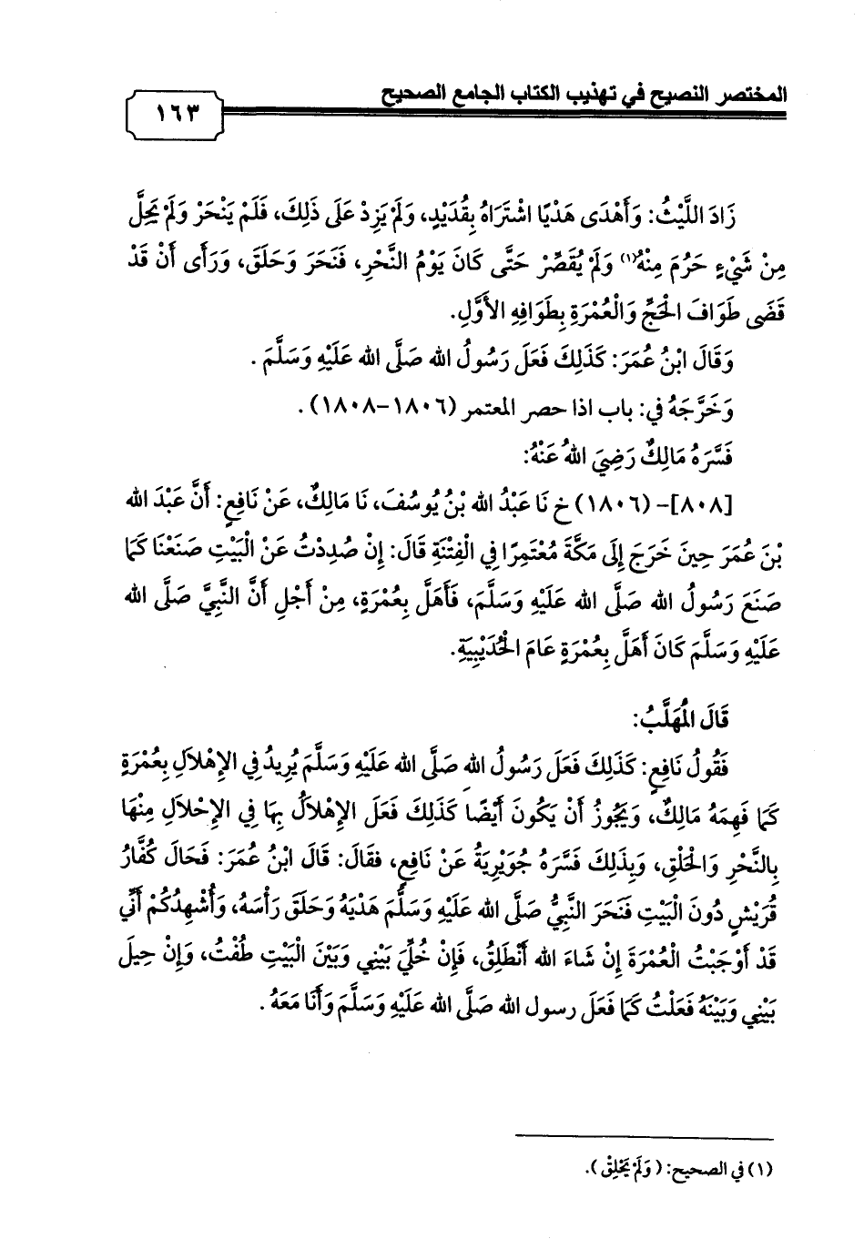 فَقُولُ نَافِعٍ: كَذَلِكَ فَعَلَ رَسُولُ اللهِ صَلَّى الله عَلَيْهِ وَسَلَّمَ يُرِيدُ فِي الإِهْلاَلِ بِعُمْرَةٍ كَمَا فَهِمَهُ مَالِكٌ، وَيَجُوزُ أَنْ يَكُونَ أَيْضًا كَذَلِكَ فَعَلَ الإِهْلاَلُ بِهَا فِي الإِحْلاَلِ مِنْهَا بِالنَّحْرِ وَالْحَلْقِ، وَبِذَلِكَ فَسَّرَهُ جُوَيْرِيَةُ عَنْ نَافِعٍ، فقَالَ: قَالَ ابْنُ عُمَرَ: فَحَالَ كُفَّارُ قُرَيْشٍ دُونَ الْبَيْتِ فَنَحَرَ النَّبِيُّ صَلَّى الله عَلَيْهِ وَسَلَّمَ هَدْيَهُ وَحَلَقَ رَأْسَهُ, وَأُشْهِدُكُمْ أَنِّي قَدْ أَوْجَبْتُ الْعُمْرَةَ إِنْ شَاءَ الله أَنْطَلِقُ, فَإِنْ خُلِّيَ بَيْنِي وَبَيْنَ الْبَيْتِ طُفْتُ, وَإِنْ حِيلَ بَيْنِي وَبَيْنَهُ فَعَلْتُ كَمَا فَعَلَ رسول الله صَلَّى الله عَلَيْهِ وَسَلَّمَ وَأَنَا مَعَهُ.