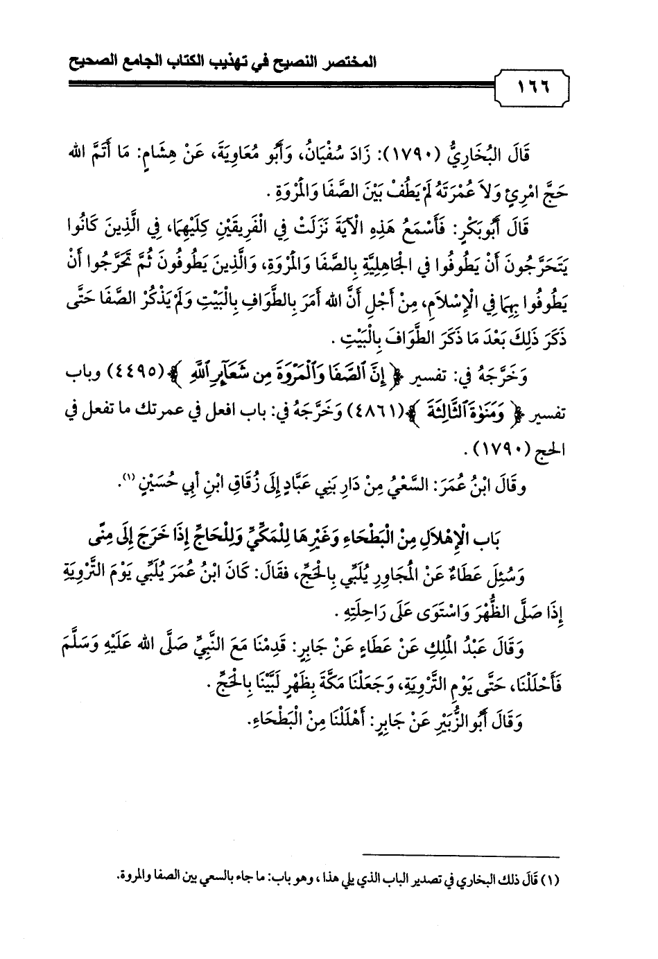 وَخَرَّجَهُ في: تفسير {إِنَّ الصَّفَا وَالْمَرْوَةَ مِنْ شَعَائِرِ اللَّهِ} (4495) وباب تفسير {وَمَنَاةَ الثَّالِثَةَ} (4861) وَخَرَّجَهُ في: باب افعل في عمرتك ما تفعل في الحج (1790).