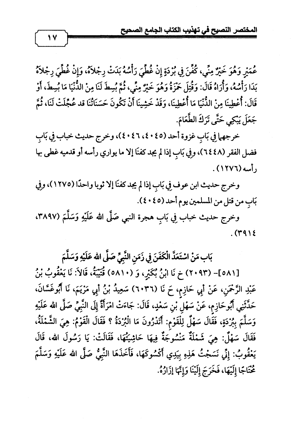 خرجهما فِي بَابِ غزوة أحد (4045, 4046) , وخرج حديث خباب فِي بَابِ فضل الفقر (6448) , وفِي بَابِ إذا لم يجد كفنَا إلا ما يواري رأسه أو قدميه غطى بها رأسه (1276).