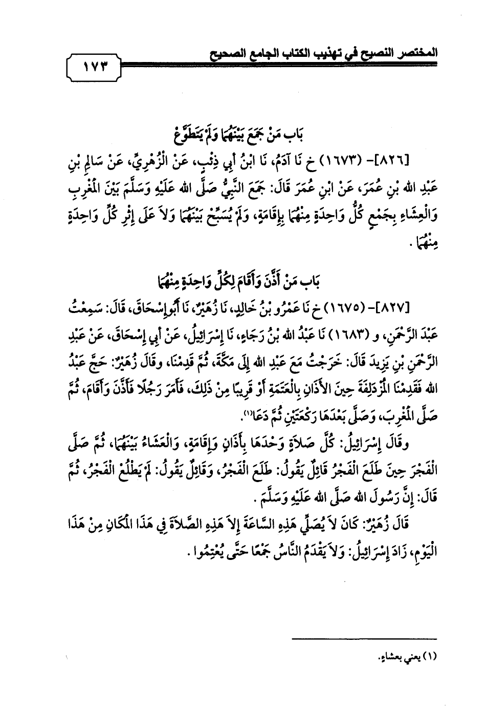 [826]- (1673) خ نَا آدَمُ، نَا ابْنُ أبِي ذِئْبٍ، عَنْ الْزُهْرِيِّ، عَنْ سَالِمِ بْنِ عَبْدِ الله بْنِ عُمَرَ، عَنْ ابْنِ عُمَرَ قَالَ: جَمَعَ النَّبِيُّ صَلَّى الله عَلَيْهِ وَسَلَّمَ بَيْنَ الْمَغْرِبِ وَالْعِشَاءِ بِجَمْعٍ كُلُّ وَاحِدَةٍ مِنْهُمَا بِإِقَامَةٍ, وَلَمْ يُسَبِّحْ بَيْنَهُمَا وَلاَ عَلَى إِثْرِ كُلِّ وَاحِدَةٍ مِنْهُمَا.