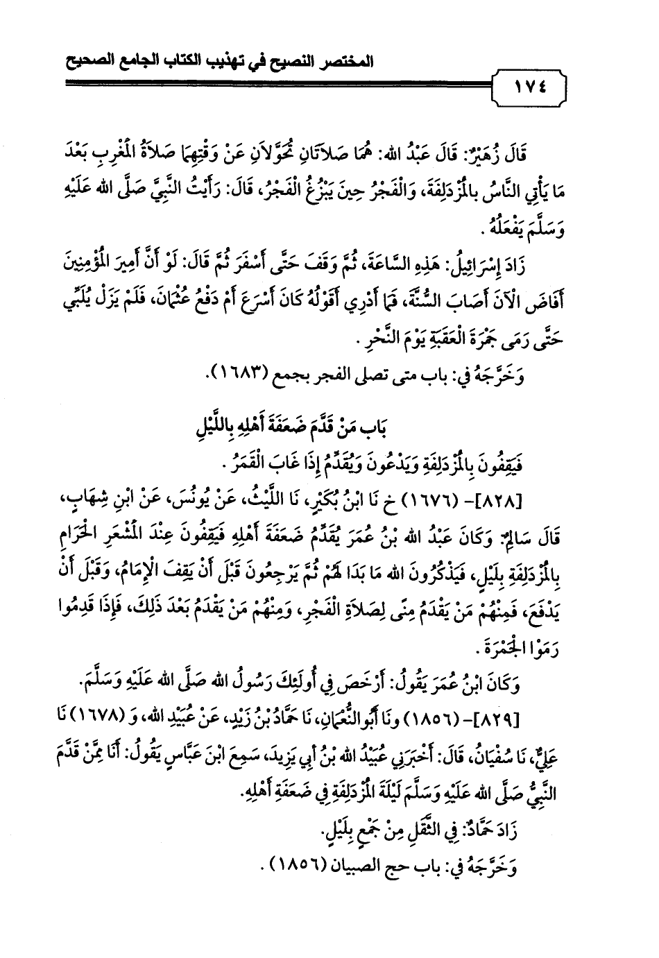 [828]- (1676) خ نَا ابْنُ بُكَيْرٍ، نَا اللَّيْثُ، عَنْ يُونُسَ، عَنْ ابْنِ شِهَابٍ، قَالَ سَالِمٌ: وَكَانَ عَبْدُ الله بْنُ عُمَرَ يُقَدِّمُ ضَعَفَةَ أَهْلِهِ فَيَقِفُونَ عِنْدَ الْمَشْعَرِ الْحَرَامِ بِالْمُزْدَلِفَةِ بِلَيْلٍ, فَيَذْكُرُونَ الله مَا بَدَا لَهُمْ ثُمَّ يَرْجِعُونَ قَبْلَ أَنْ يَقِفَ الْإِمَامُ, وَقَبْلَ أَنْ يَدْفَعَ, فَمِنْهُمْ مَنْ يَقْدَمُ مِنًى لِصَلاَةِ الْفَجْرِ, وَمِنْهُمْ مَنْ يَقْدَمُ بَعْدَ ذَلِكَ, فَإِذَا قَدِمُوا رَمَوْا الْجَمْرَةَ.