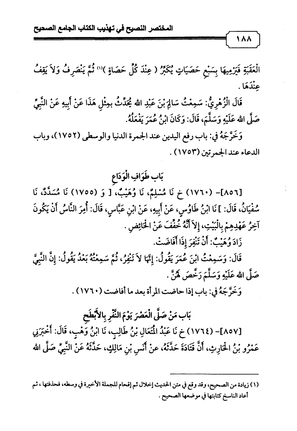 (¬1) زيادة من الصحيح، وقد وقع في متن الحديث إخلال ثم إقحام للجملة الأخيرة في وسطه، فحذفتها، ثم أعاد الناسخ كتابتها في موضعها الصحيح.