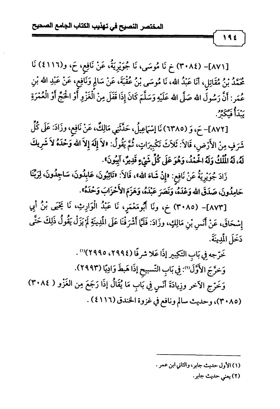 [871]- (3084) خ نَا مُوسَى، نَا جُوَيْرِيَةُ، عَنْ نَافِعٍ، حَ، و (4116) نَا مُحَمَّدُ بْنُ مُقَاتِلٍ، أنَا عَبْدُ الله، نَا مُوسَى بْنُ عُقْبَةَ، عَنْ سَالِمٍ وَنَافِعٍ، عَنْ عَبْدِ الله بْنِ عُمَر: أَنَّ رَسُولَ الله صَلَّى الله عَلَيْهِ وَسَلَّمَ كَانَ إِذَا قَفَلَ مِنْ الْغَزْوِ أَوْ الْحَجِّ أَوْ الْعُمْرَةِ يَبْدَأُ فَيُكَبِّرُ.