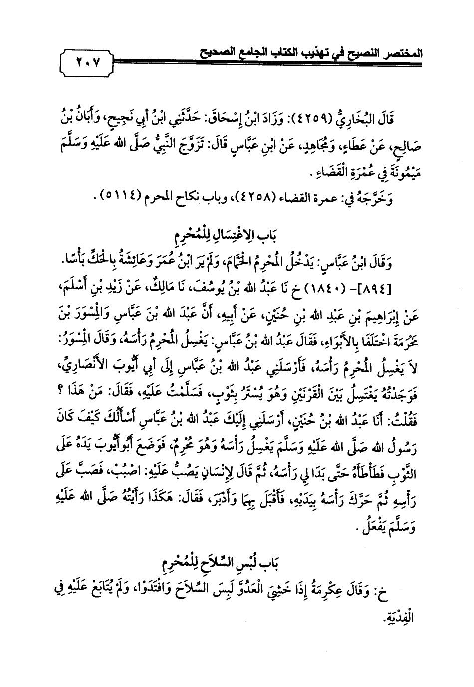 [894]- (1840) خ نَا عَبْدُ الله بْنُ يُوسُفَ، نَا مَالِكٌ، عَنْ زَيْدِ بْنِ أَسْلَمَ، عَنْ إِبْرَاهِيمَ بْنِ عَبْدِ الله بْنِ حُنَيْنٍ، عَنْ أَبِيهِ، أَنَّ عَبْدَ الله بْنَ عَبَّاسِ وَالْمِسْوَرَ بْنَ مَخْرَمَةَ اخْتَلَفَا بِالأَبْوَاءِ, فَقَالَ عَبْدُ الله بْنُ عَبَّاسٍ: يَغْسِلُ الْمُحْرِمُ رَأْسَهُ, وَقَالَ الْمِسْوَرُ: لاَ يَغْسِلُ الْمُحْرِمُ رَأْسَهُ, فَأَرْسَلَنِي عَبْدُ الله بْنُ عَبَّاسِ إِلَى أبِي أَيُّوبَ الأَنْصَارِيِّ, فَوَجَدْتُهُ يَغْتَسِلُ بَيْنَ الْقَرْنَيْنِ وَهُوَ يُسْتَرُ بِثَوْبٍ, فَسَلَّمْتُ عَلَيْهِ, فَقَالَ: مَنْ هَذَا؟ فَقُلْتُ: أَنَا عَبْدُ الله بْنُ حُنَيْنٍ, أَرْسَلَنِي إِلَيْكَ عَبْدُ الله بْنُ عَبَّاسِ أَسْأَلُكَ كَيْفَ كَانَ رَسُولُ الله صَلَّى الله عَلَيْهِ وَسَلَّمَ يَغْسِلُ رَأْسَهُ وَهُوَ مُحْرِمٌ, فَوَضَعَ أَبُوأَيُّوبَ يَدَهُ عَلَى الثَّوْبِ فَطَأْطَأَهُ حَتَّى بَدَا لِي رَأْسَهُ, ثُمَّ قَالَ لِإِنْسَانٍ يَصُبُّ عَلَيْهِ: اصْبُبْ, فَصَبَّ عَلَى رَأْسِهِ ثُمَّ حَرَّكَ رَأْسَهُ بِيَدَيْهِ, فَأَقْبَلَ بِهِمَا وَأَدْبَرَ, فَقَالَ: هَكَذَا رَأَيْتُهُ صَلَّى الله عَلَيْهِ وَسَلَّمَ يَفْعَلُ.