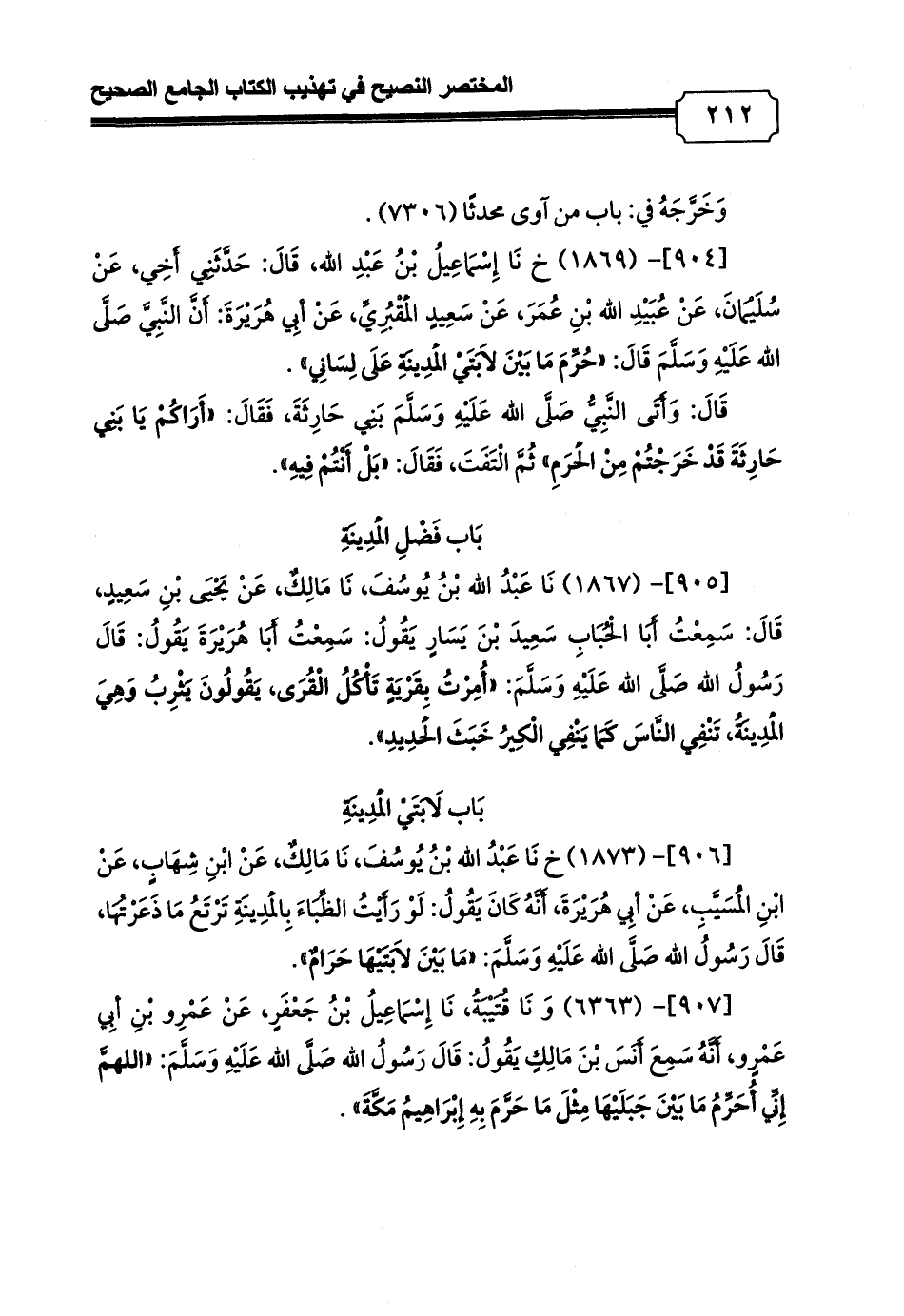 [904]- (1869) خ نَا إِسْمَاعِيلُ بْنُ عَبْدِ الله، قَالَ: حَدَّثَنِي أَخِي، عَنْ سُلَيْمَانَ، عَنْ عُبَيْدِ الله بْنِ عُمَرَ، عَنْ سَعِيدٍ الْمَقْبُرِيِّ، عَنْ أبِي هُرَيْرَةَ: أَنَّ النَّبِيَّ صَلَّى الله عَلَيْهِ وَسَلَّمَ قَالَ: «حُرِّمَ مَا بَيْنَ لاَبَتَيْ الْمَدِينَةِ عَلَى لِسَانِي».