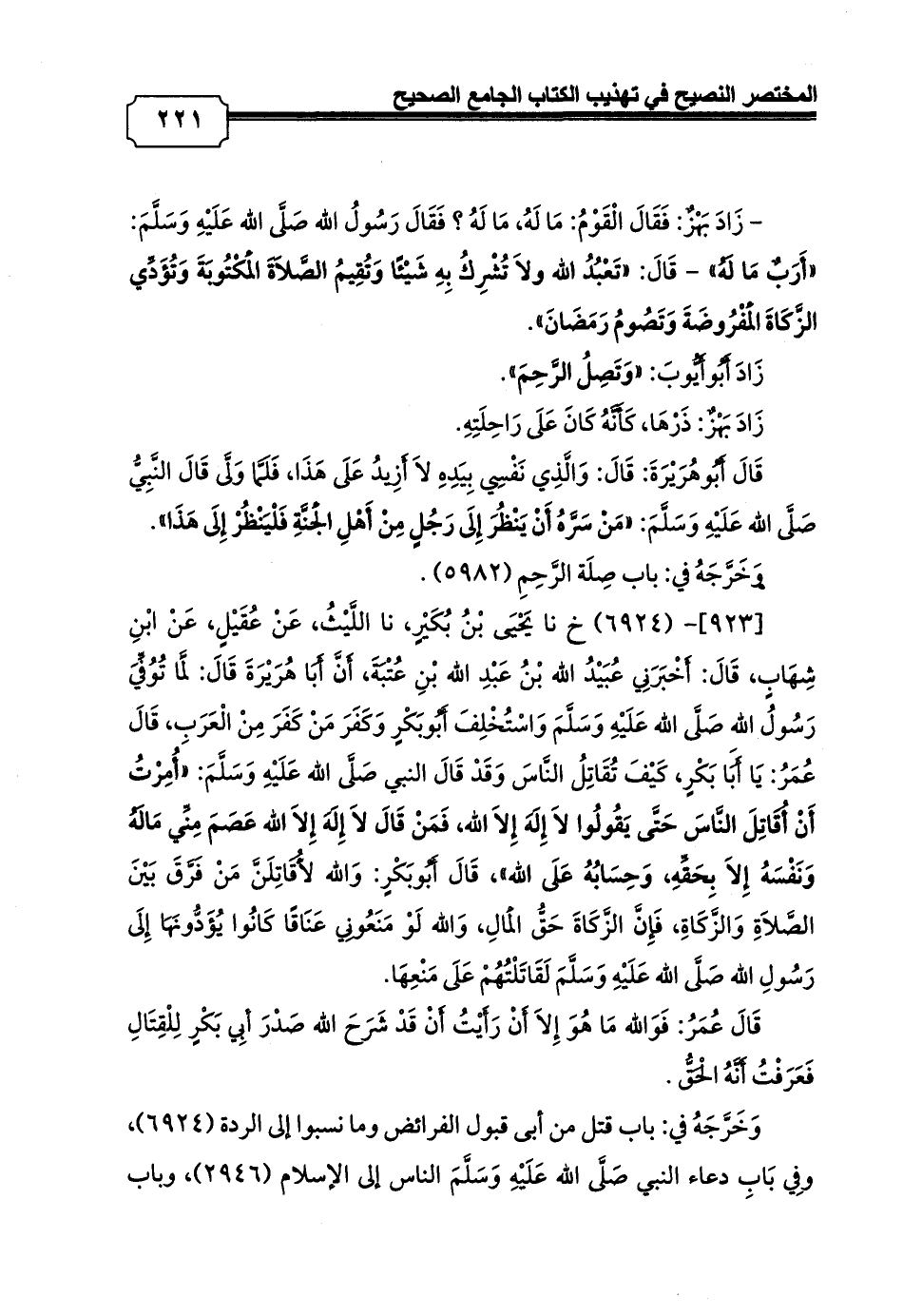 [923]- (6924) خ نا يَحْيَى بْنُ بُكَيْرٍ، نا اللَّيْثُ، عَنْ عُقَيْلٍ، عَنْ ابْنِ شِهَابٍ، قَالَ: أَخْبَرَنِي عُبَيْدُ الله بْنُ عَبْدِ الله بْنِ عُتْبَةَ، أَنَّ أَبَا هُرَيْرَةَ قَالَ: لَمَّا تُوُفِّيَ رَسُولُ اللهِ صَلَّى الله عَلَيْهِ وَسَلَّمَ وَاسْتُخْلِفَ أَبُوبَكْرٍ وَكَفَرَ مَنْ كَفَرَ مِنْ الْعَرَبِ, قَالَ عُمَرُ: يَا أَبَا بَكْرٍ, كَيْفَ تُقَاتِلُ النَّاسَ وَقَدْ قَالَ النبي صَلَّى الله عَلَيْهِ وَسَلَّمَ: «أُمِرْتُ أَنْ أُقَاتِلَ النَّاسَ حَتَّى يَقُولُوا لاَ إِلَهَ إِلاَ الله, فَمَنْ قَالَ لاَ إِلَهَ إِلاَ الله عَصَمَ مِنِّي مَالَهُ وَنَفْسَهُ إِلاَ بِحَقِّهِ، وَحِسَابُهُ عَلَى الله»، قَالَ أَبُوبَكْرٍ: وَالله لأَُقَاتِلَنَّ مَنْ فَرَّقَ بَيْنَ الصَّلاَةِ وَالزَّكَاةِ, فَإِنَّ الزَّكَاةَ حَقُّ الْمَالِ, وَالله لَوْ مَنَعُونِي عَنَاقًا كَانُوا يُؤَدُّونَهَا إِلَى رَسُولِ الله صَلَّى الله عَلَيْهِ وَسَلَّمَ لَقَاتَلْتُهُمْ عَلَى مَنْعِهَا.