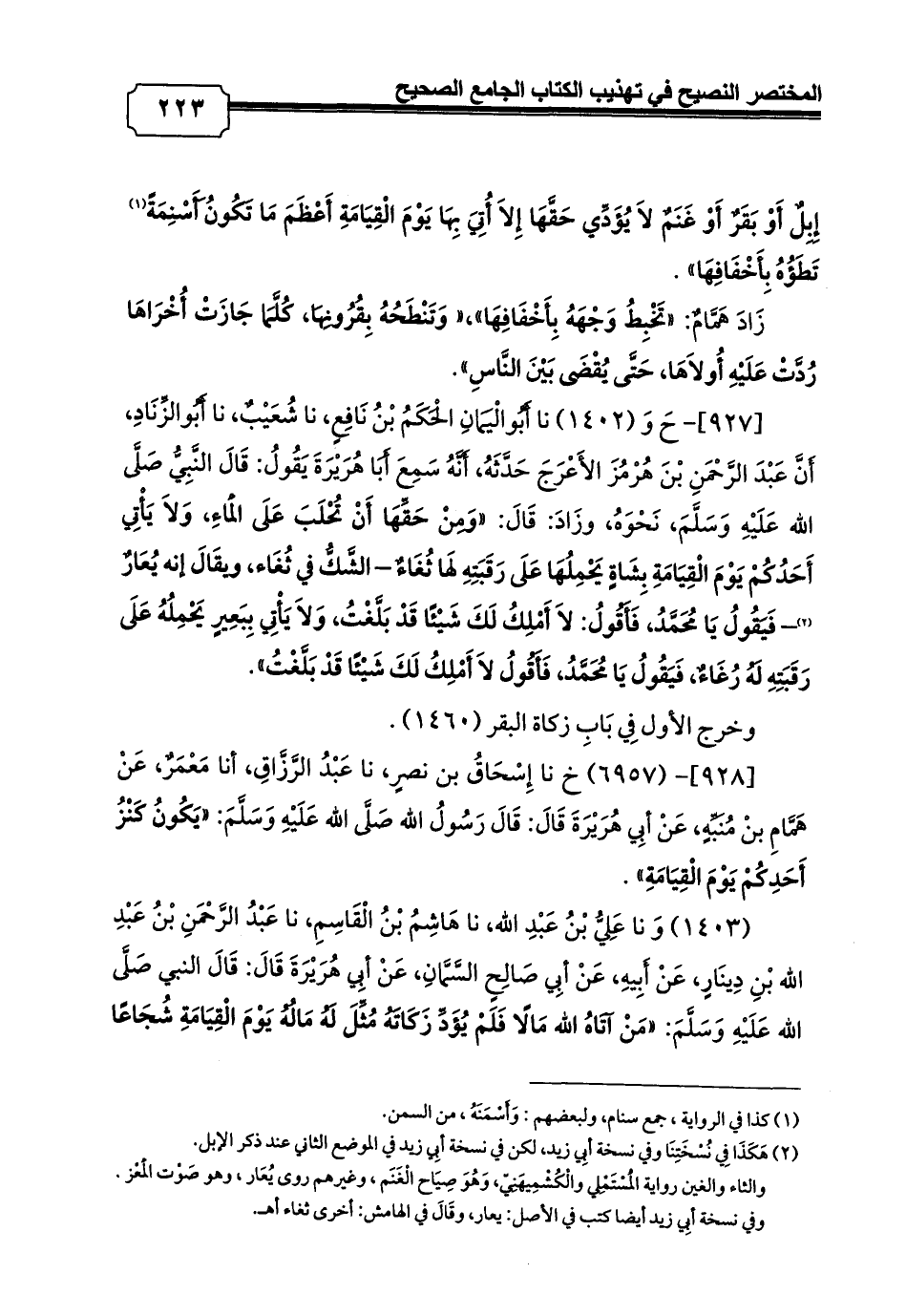 [928]- (6957) خ نا إِسْحَاقُ بن نصرٍ، نا عَبْدُ الرَّزَّاقِ، أنا مَعْمَرٌ، عَنْ هَمَّامِ بنْ مُنَبِّهٍ، عَنْ أبِي هُرَيْرَةَ قَالَ: قَالَ رَسُولُ الله صَلَّى الله عَلَيْهِ وَسَلَّمَ: «يَكُونُ كَنْزُ أَحَدِكُمْ يَوْمَ الْقِيَامَةِ».