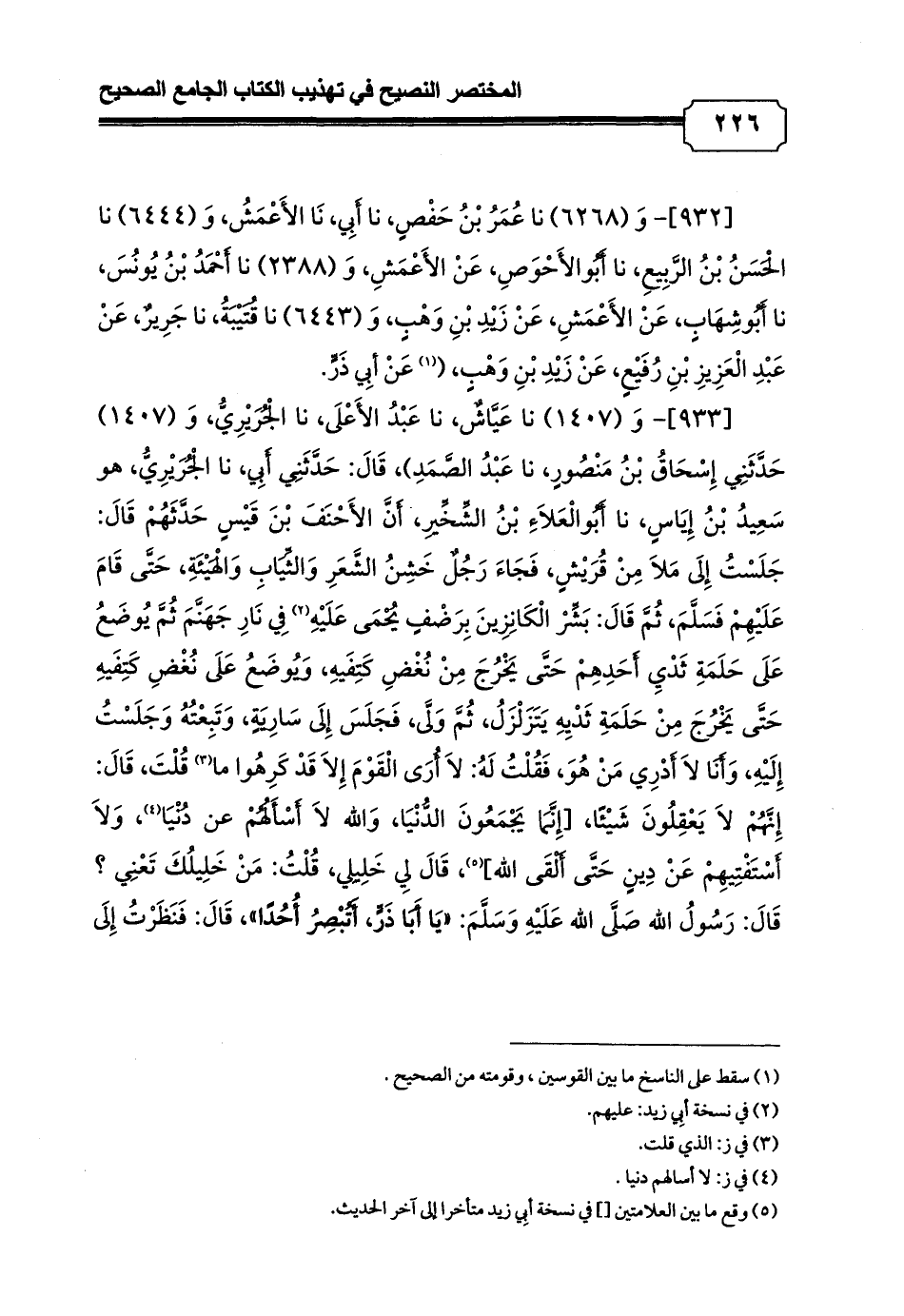 [932]- وَ (6268) نا عُمَرُ بْنُ حَفْصٍ، نا أَبِي، نَا الأَعْمَشُ, وَ (6444) نا الْحَسَنُ بْنُ الرَّبِيعِ، نا أَبُوالأَحْوَصِ، عَنْ الأَعْمَشِ، وَ (2388) نا أَحْمَدُ بْنُ يُونُسَ، نا أَبُوشِهَابٍ، عَنْ الأَعْمَشِ، عَنْ زَيْدِ بْنِ وَهْبٍ, وَ (6443) نا قُتَيْبَةُ، نا جَرِيرٌ، عَنْ عَبْدِ الْعَزِيزِ بْنِ رُفَيْعٍ، عَنْ زَيْدِ بْنِ وَهْبٍ، ((¬1) عَنْ أبِي ذَرٍّ.