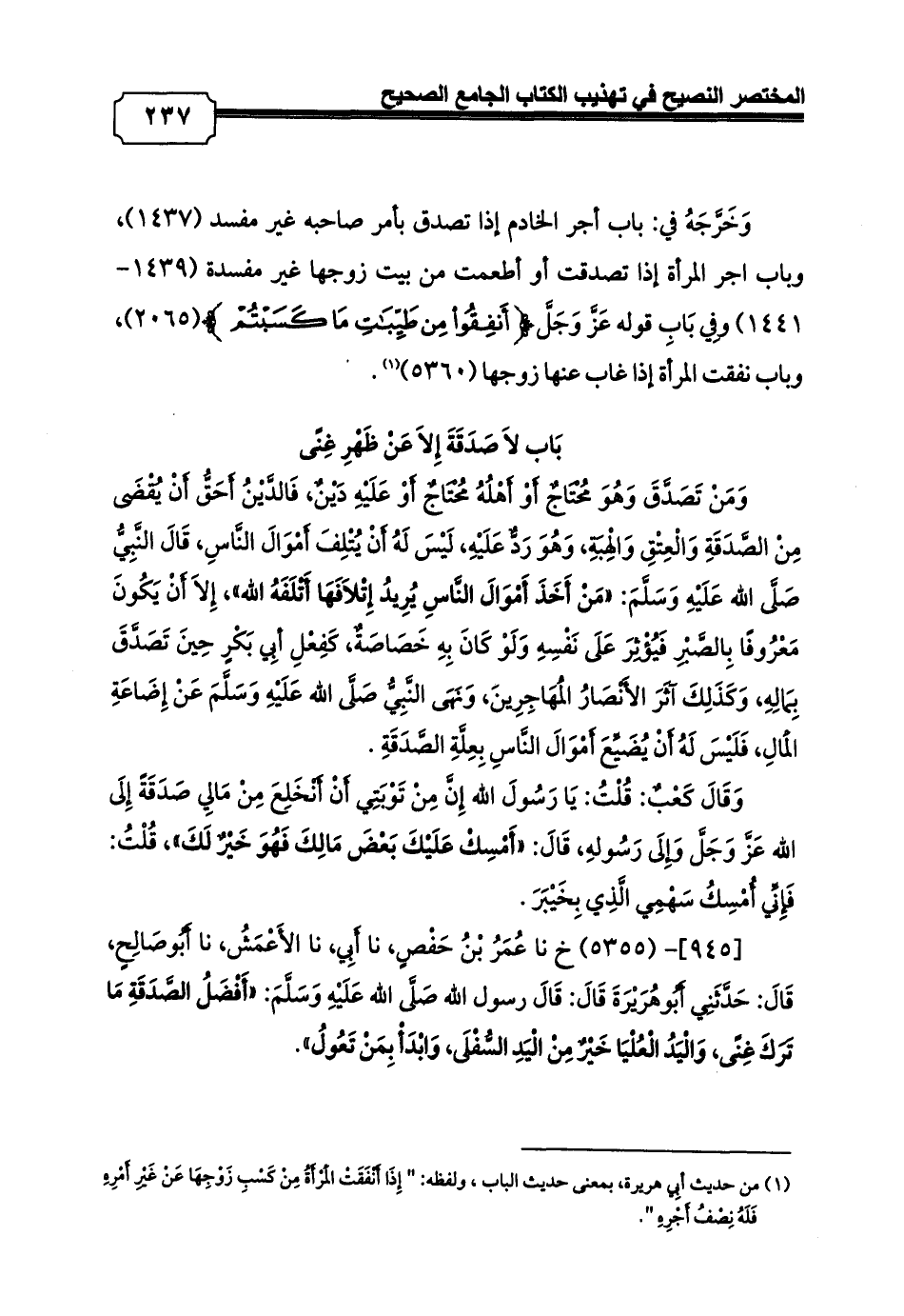 [945]- (5355) خ نا عُمَرُ بْنُ حَفْصٍ، نا أَبِي، نا الأَعْمَشُ، نا أَبُوصَالِحٍ، قَالَ: حَدَّثَنِي أَبُوهُرَيْرَةَ قَالَ: قَالَ رسول الله صَلَّى الله عَلَيْهِ وَسَلَّمَ: «أَفْضَلُ الصَّدَقَةِ مَا تَرَكَ غِنًى, وَالْيَدُ الْعُلْيَا خَيْرٌ مِنْ الْيَدِ السُّفْلَى, وَابْدَأْ بِمَنْ تَعُولُ».