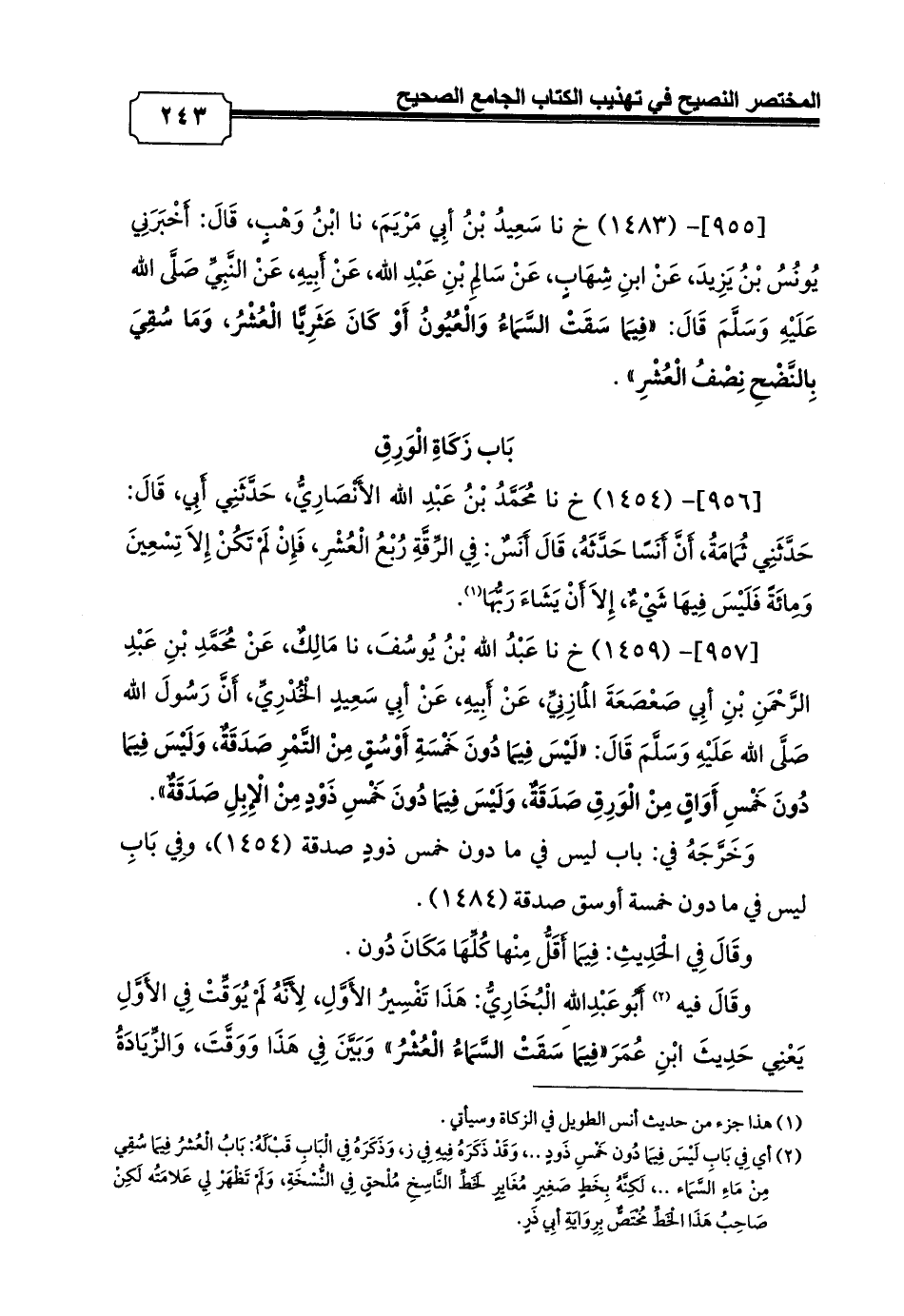 [957]- (1459) خ نا عَبْدُ الله بْنُ يُوسُفَ، نا مَالِكٌ، عَنْ مُحَمَّدِ بْنِ عَبْدِ الرَّحْمَنِ بْنِ أبِي صَعْصَعَةَ الْمَازِنِيِّ، عَنْ أَبِيهِ، عَنْ أبِي سَعِيدٍ الْخُدْرِيِّ، أَنَّ رَسُولَ الله صَلَّى الله عَلَيْهِ وَسَلَّمَ قَالَ: «لَيْسَ فِيمَا دُونَ خَمْسَةِ أَوْسُقٍ مِنْ التَّمْرِ صَدَقَةٌ, وَلَيْسَ فِيمَا دُونَ خَمْسِ أَوَاقٍ مِنْ الْوَرِقِ صَدَقَةٌ, وَلَيْسَ فِيمَا دُونَ خَمْسِ ذَوْدٍ مِنْ الْإِبِلِ صَدَقَةٌ».