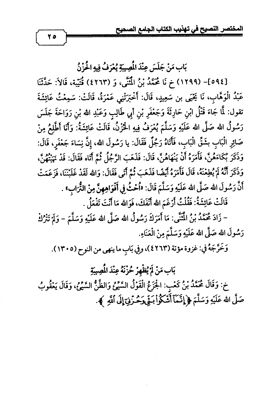 [594]- (1299) خ نَا مُحَمَّدُ بْنُ الْمُثَنَّى، وَ (4263) قُتَيْبة، قَالاَ: حَدَّثَنَا عَبْدُ الْوَهَّابِ، نَا يَحْيَى بن سَعِيدٍ، قَالَ: أَخْبَرَتْنِي عَمْرَةُ، قَالَتْ: سَمِعْتُ عَائِشَةَ تقول: لَمَّا جَاءَ قَتْلُ ابْنِ حَارِثَةَ وَجَعْفَرِ بْنِ أبِي طَالِبٍ وَعَبْدِ الله بْنِ رَوَاحَةَ جَلَسَ رَسُولُ الله صَلَّى الله عَلَيْهِ وَسَلَّمَ يُعْرَفُ فِيهِ الْحُزْنُ، قَالَتْ عَائِشَةُ: وَأَنَا أَطَّلِعُ مِنْ صَائِرِ الْبَابِ بشَقِّ الْبَابِ، فَأَتَاهُ رَجُلٌ فَقَالَ: يا رَسُولَ الله، إِنَّ نِسَاءَ جَعْفَرٍ، قَالَ: وَذَكَرَ بُكَاءَهُنَّ, فَأَمَرَهُ أَنْ يَنْهَاهُنَّ, قَالَ: فَذَهَبَ الرَّجُلُ ثُمَّ أَتَاه فَقَالَ: قَدْ نَهَيْتُهُنَّ, وَذَكَرَ أَنَّهُ لَمْ يُطِعْنَهُ, قَالَ فَأَمَرَهُ أَيْضًا فَذَهَبَ ثُمَّ أَتَى فَقَالَ: وَالله لَقَدْ غَلَبْنَنَا, فَزَعَمَتْ أَنَّ رَسُولَ الله صَلَّى الله عَلَيْهِ وَسَلَّمَ قَالَ: «اُحْثُ فِي أَفْوَاهِهِنَّ مِنْ التُّرَابِ».