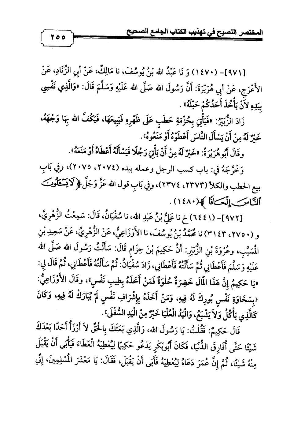 [971]- (1470) وَنَا عَبْدُ الله بْنُ يُوسُفَ، نا مَالِكٌ، عَنْ أبِي الزِّنَادِ، عَنْ الأَعْرَجِ، عَنْ أبِي هُرَيْرَةَ: أَنَّ رَسُولَ الله صَلَّى الله عَلَيْهِ وَسَلَّمَ قَالَ: «وَالَّذِي نَفْسِي بِيَدِهِ لاَنْ يَأْخُذَ أَحَدُكُمْ حَبْلَهُ».