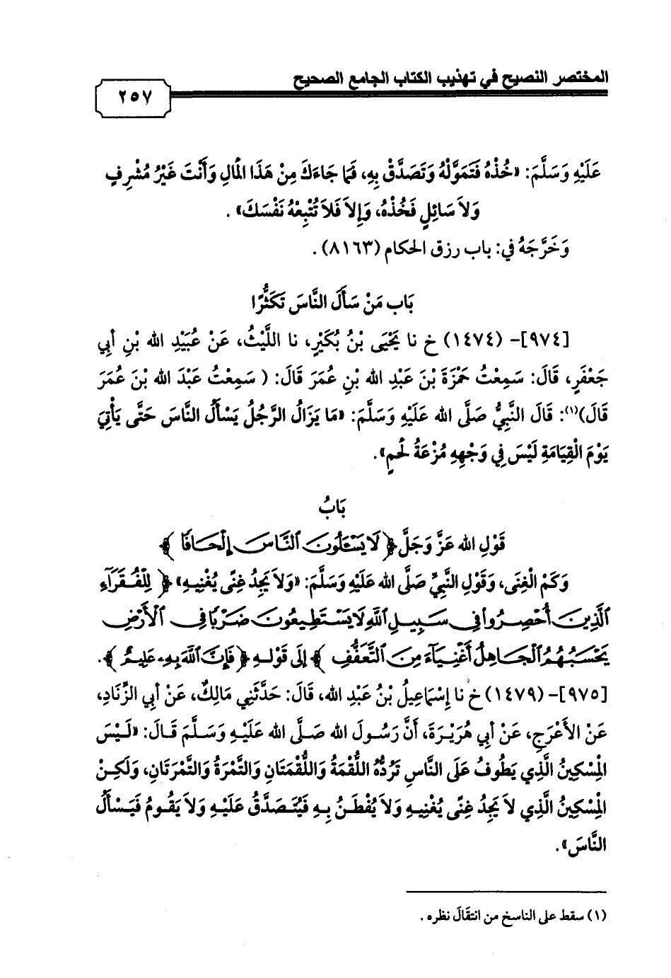 [974]- (1474) خ نا يَحْيَى بْنُ بُكَيْرٍ، نا اللَّيْثُ، عَنْ عُبَيْدِ الله بْنِ أبِي جَعْفَرٍ، قَالَ: سَمِعْتُ حَمْزَةَ بْنَ عَبْدِ الله بْنِ عُمَرَ قَالَ: (سَمِعْتُ عَبْدَ الله بْنَ عُمَرَ قَالَ) (¬1): قَالَ النَّبِيُّ صَلَّى الله عَلَيْهِ وَسَلَّمَ: «مَا يَزَالُ الرَّجُلُ يَسْأَلُ النَّاسَ حَتَّى يَأْتِيَ يَوْمَ الْقِيَامَةِ لَيْسَ فِي وَجْهِهِ مُزْعَةُ لَحْمٍ».