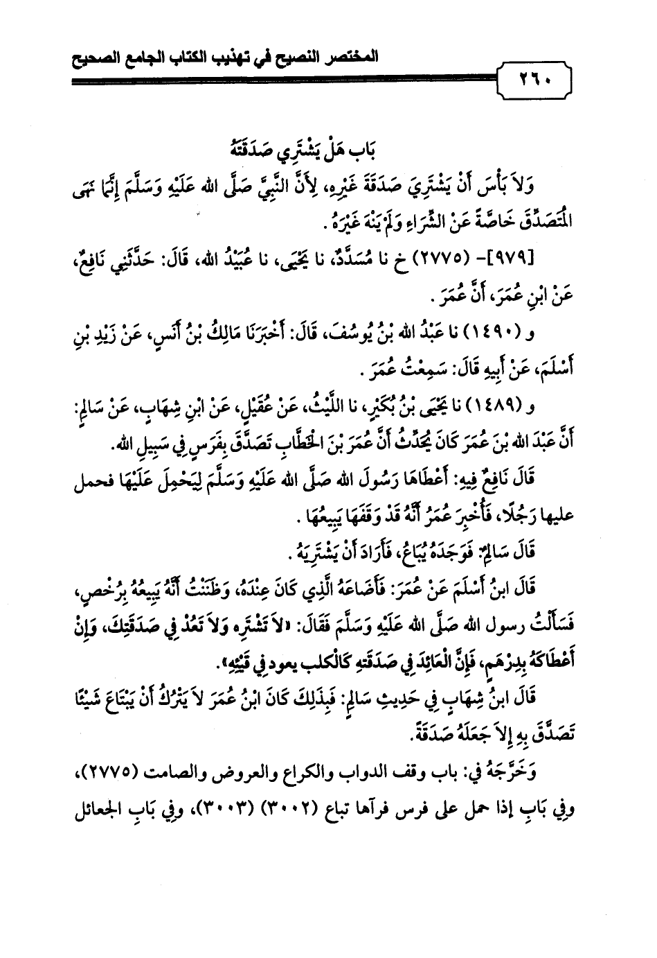 و (1489) نا يَحْيَى بْنُ بُكَيْرٍ، نا اللَّيْثُ، عَنْ عُقَيْلٍ، عَنْ ابْنِ شِهَابٍ، عَنْ سَالِمٍ: أَنَّ عَبْدَ الله بْنَ عُمَرَ كَانَ يُحَدِّثُ أَنَّ عُمَرَ بْنَ الْخَطَّابِ تَصَدَّقَ بِفَرَسٍ فِي سَبِيلِ الله.