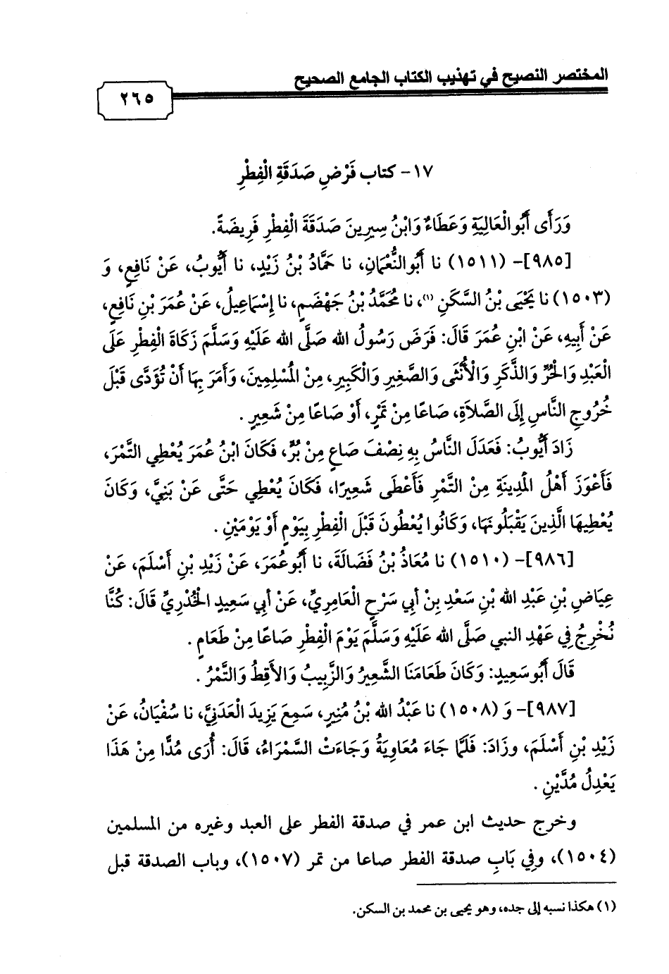 [986]- (1510) نا مُعَاذُ بْنُ فَضَالَةَ، نا أَبُوعُمَرَ، عَنْ زَيْدِ بْنِ أَسْلَمَ، عَنْ عِيَاضِ بْنِ عَبْدِ الله بْنِ سَعْدِ بِنْ أبِي سَرْحٍ الْعَامِرِيِّ، عَنْ أبِي سَعِيدٍ الْخُدْرِيِّ قَالَ: كُنَّا نُخْرِجُ فِي عَهْدِ النبي صَلَّى الله عَلَيْهِ وَسَلَّمَ يَوْمَ الْفِطْرِ صَاعًا مِنْ طَعَامٍ.