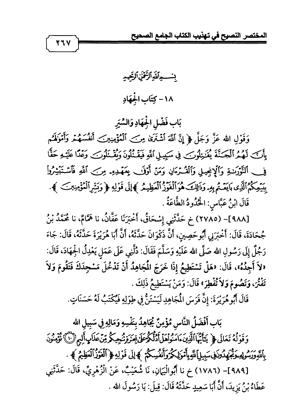 [988]- (2785) خ حَدَّثَنِي إِسْحَاقُ، أَخْبَرَنَا عَفَّانُ، نا هَمَّامٌ، نا مُحَمَّدُ بْنُ جُحَادَةَ، قَالَ: أَخْبَرَنِي أَبُوحَصِينٍ، أَنَّ ذَكْوَانَ حَدَّثَهُ، أَنَّ أَبَا هُرَيْرَةَ حَدَّثَهُ، قَالَ: جَاءَ رَجُلٌ إِلَى رَسُولِ الله صَلَّى الله عَلَيْهِ وَسَلَّمَ فَقَالَ: دُلَّنِي عَلَى عَمَلٍ يَعْدِلُ الْجِهَادَ, قَالَ: «لاَ أَجِدُهُ» , قَالَ: «هَلْ تَسْتَطِيعُ إِذَا خَرَجَ الْمُجَاهِدُ أَنْ تَدْخُلَ مَسْجِدَكَ فَتَقُومَ وَلاَ تَفْتُرَ, وَتَصُومَ وَلاَ تُفْطِرَ» قَالَ: وَمَنْ يَسْتَطِيعُ ذَلِكَ.