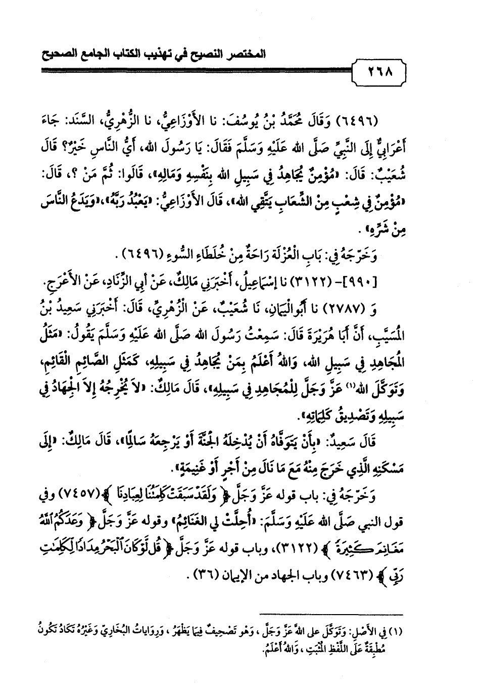 (6496) وَقَالَ مُحَمَّدُ بْنُ يُوسُفَ: نا الأَوْزَاعِيُّ، نا الزُّهْرِيُّ, السَّنَد: جَاءَ أَعْرَابِيٌّ إِلَى النَّبِيِّ صَلَّى الله عَلَيْهِ وَسَلَّمَ فَقَالَ: يَا رَسُولَ الله, أَيُّ النَّاسِ خَيْرٌ؟ قَالَ شُعَيْبٌ: قَالَ: «مُؤْمِنٌ يُجَاهِدُ فِي سَبِيلِ الله بِنَفْسِهِ وَمَالِهِ» , قَالَوا: ثُمَّ مَنْ؟ , قَالَ: «مُؤْمِنٌ فِي شِعْبٍ مِنْ الشِّعَابِ يَتَّقِي الله» , قَالَ الأَوْزَاعِيُّ: «يَعْبُدُ رَبَّهُ» , «وَيَدَعُ النَّاسَ مِنْ شَرِّهِ».