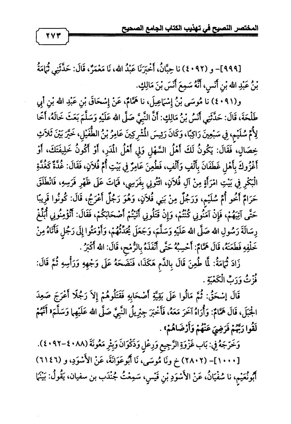 و (4091) نا مُوسَى بْنُ إِسْمَاعِيلَ، نا هَمَّامٌ، عَنْ إِسْحَاقَ بْنِ عَبْدِ الله بْنِ أبِي طَلْحَةَ، قَالَ: حَدَّثَنِي أَنَسُ بْنُ مَالِكٍ: أَنَّ النَّبِيَّ صَلَّى الله عَلَيْهِ وَسَلَّمَ بَعَثَ خَالَهُ, أَخًا لِأُمِّ سُلَيْمٍ, فِي سَبْعِينَ رَاكِبًا, وَكَانَ رَئِيسَ الْمُشْرِكِينَ عَامِرُ بْنُ الطُّفَيْلِ, خَيَّرَ بَيْنَ ثَلاَثِ خِصَالٍ, فَقَالَ: يَكُونُ لَكَ أَهْلُ السَّهْلِ وَلِي أَهْلُ الْمَدَرِ, أَوْ أَكُونُ خَلِيفَتَكَ, أَوْ أَغْزُوكَ بِأَهْلِ غَطَفَانَ بِأَلْفٍ وَأَلْفٍ, فَطُعِنَ عَامِرٌ فِي بَيْتِ أُمِّ فُلاَنٍ, فَقَالَ: غُدَّةٌ كَغُدَّةِ الْبَكْرِ فِي بَيْتِ امْرَأَةٍ مِنْ آلِ فُلاَنٍ, ائْتُونِي بِفَرَسِي, فَمَاتَ عَلَى ظَهْرِ فَرَسِهِ, فَانْطَلَقَ حَرَامٌ أَخُو أُمِّ سُلَيْمٍ, وَرَجُلٌ مِنْ بَنِي فُلاَنٍ, وَهُوَ رَجُلٌ أَعْرَجُ, قَالَ: كُونُوا قَرِيبًا حَتَّى آتِيَهُمْ, فَإِنْ آمَنُونِي كُنْتُمْ, وَإِنْ قَتَلُونِي أَتَيْتُمْ أَصْحَابَكُمْ, فَقَالَ: أَتُؤْمِنُونِي أُبَلِّغْ رِسَالَةَ رَسُولِ الله صَلَّى الله عَلَيْهِ وَسَلَّمَ, وَجَعَلَ يُحَدِّثُهُمْ, وَأَوْمَئُوا إِلَى رَجُلٍ فَأَتَاهُ مِنْ خَلْفِهِ فَطَعَنَهُ, قَالَ هَمَّامٌ: أَحْسِبُهُ حَتَّى أَنْفَذَهُ بِالرُّمْحِ, قَالَ: الله أَكْبَرُ.