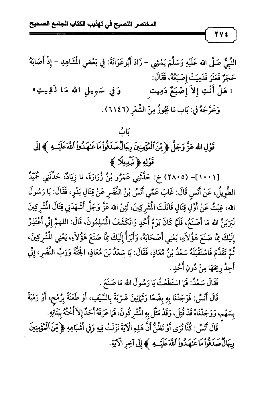 قَالَ أَنَسٌ: فَوَجَدْنَا بِهِ بِضْعًا وَثَمَانِينَ ضَرْبَةً بِالسَّيْفِ, أَوْ طَعْنَةً بِرُمْحٍ, أَوْ رَمْيَةً بِسَهْمٍ, وَوَجَدْنَاهُ قَدْ قُتِلَ, وَقَدْ مَثَّلَ بِهِ الْمُشْرِكُونَ, فَمَا عَرَفَهُ أَحَدٌ إِلاَ أُخْتُهُ بِبَنَانِهِ.