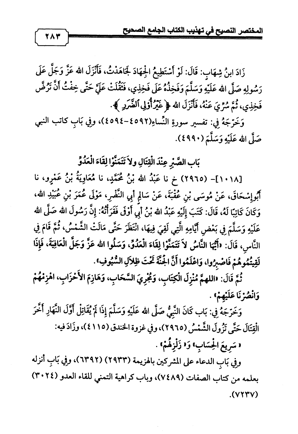 [1018]- (2965) خ نا عَبْدُ الله بْنُ مُحَمَّدٍ، نا مُعَاوِيَةُ بْنُ عَمْرٍو، نا أَبُوإِسْحَاقَ، عَنْ مُوسَى بْنِ عُقْبَةَ، عَنْ سَالِمٍ أبِي النَّضْرِ، مَوْلَى عُمَرَ بْنِ عُبَيْدِ الله, وَكَانَ كَاتِبًا لَهُ, قَالَ: كَتَبَ إِلَيْهِ عَبْدُ الله بْنُ أبِي أَوْفَى فَقَرَأْتُهُ: إِنَّ رَسُولَ الله صَلَّى الله عَلَيْهِ وَسَلَّمَ فِي بَعْضِ أَيَّامِهِ الَّتِي لَقِيَ فِيهَا, انْتَظَرَ حَتَّى مَالَتْ الشَّمْسُ, ثُمَّ قَامَ فِي النَّاسِ, قَالَ: «أَيُّهَا النَّاسُ لاَ تَتَمَنَّوْا لِقَاءَ الْعَدُوِّ, وَسَلُوا الله عَزَّ وَجَلَّ الْعَافِيَةَ, فَإِذَا لَقِيتُمُوهُمْ فَاصْبِرُوا, وَاعْلَمُوا أَنَّ الْجَنَّةَ تَحْتَ ظِلاَلِ السُّيُوفِ».