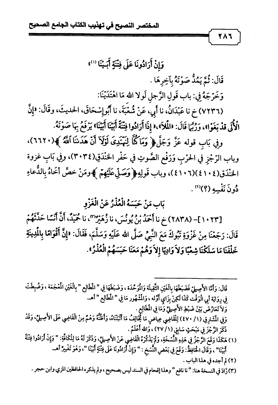 (¬1) هَكَذَا وَقَعَ الرَّجْزُ فِي هَذِهِ النُّسْخَةِ، وَلَمْ يَذْكُرْهُ الْقَاضِي عَنْ الأَصِيلِيِّ، وَذَكَرَ لَهُ مَا لِلْكَافَّةِ: " وَإِنْ أَرَادُوا فِتْنَةً أَبَيْنَا"، وَقَالَ الْحَافِظُ: وَقَعَ فِي بَعْضِ النُّسَخِ: " وَإِنْ أَرَادُونَا عَلَى فِتْنَةٍ أَبَيْنَا "، وَهْوَ تَغْييرٌ أهـ.