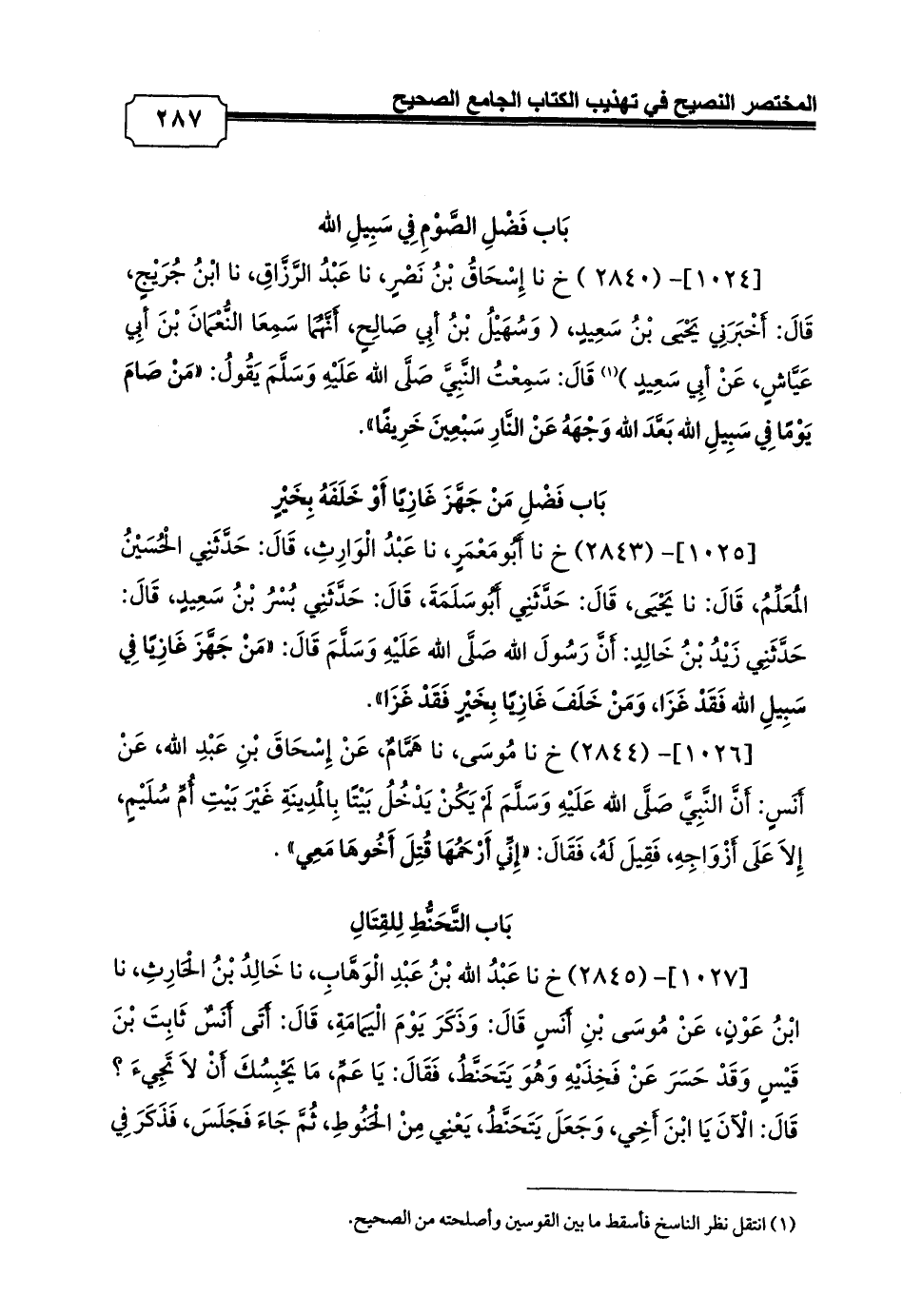 [1025]- (2843) خ نا أَبُومَعْمَرٍ، نا عَبْدُ الْوَارِثِ، قَالَ: حَدَّثَنِي الْحُسَيْنُ الْمُعَلِّمُ، قَالَ: نا يَحْيَى، قَالَ: حَدَّثَنِي أَبُوسَلَمَةَ، قَالَ: حَدَّثَنِي بُسْرُ بْنُ سَعِيدٍ، قَالَ: حَدَّثَنِي زَيْدُ بْنُ خَالِدٍ: أَنَّ رَسُولَ الله صَلَّى الله عَلَيْهِ وَسَلَّمَ قَالَ: «مَنْ جَهَّزَ غَازِيًا فِي سَبِيلِ الله فَقَدْ غَزَا, وَمَنْ خَلَفَ غَازِيًا بِخَيْرٍ فَقَدْ غَزَا».