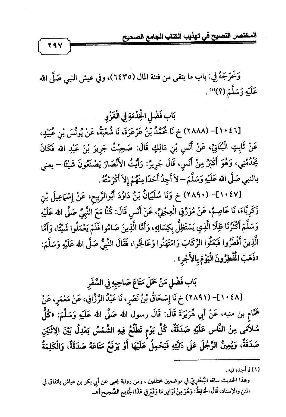 [1048]- (2891) خ نَا إِسْحَاقُ بْنُ نَصْرٍ, نَا عَبْدُ الرَّزَّاقِ, عَنْ مَعْمَرٍ, عَنْ هَمَّامٍ بن منبه, عَنْ أبِي هُرَيْرَةَ قَالَ: قَالَ رسول الله صَلَّى الله عَلَيْهِ وَسَلَّمَ: «كُلُّ سُلاَمَى مِنْ النَّاس عَلَيْهِ صَدَقَةٌ, كُلَّ يَوْمٍ تَطْلُعُ فِيهِ الشَّمْسُ يَعْدِلُ بَيْنَ الِاثْنَيْنِ صَدَقَةٌ, وَيُعِينُ الرَّجُلَ عَلَى دَابَّتِهِ فَيَحْمِلُ عَلَيْهَا أَوْ يَرْفَعُ مَتَاعَهُ صَدَقَةٌ, وَالْكَلِمَةُ