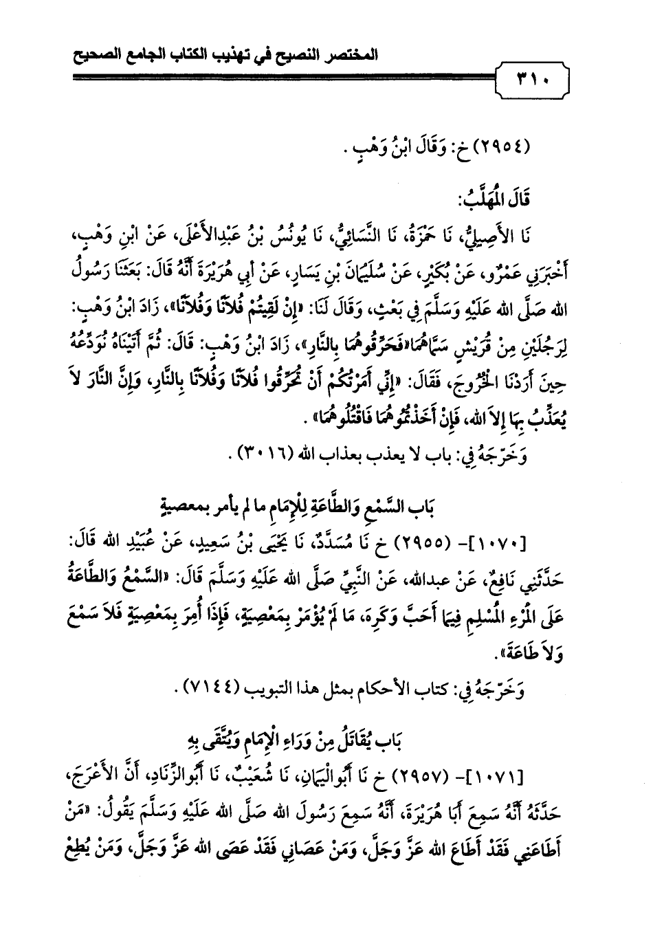 [1071]- (2957) خ نَا أَبُوالْيَمَانِ, نَا شُعَيْبٌ, نَا أَبُوالزِّنَادِ, أَنَّ الأَعْرَجَ, حَدَّثَهُ أَنَّهُ سَمِعَ أَبَا هُرَيْرَةَ, أَنَّهُ سَمِعَ رَسُولَ الله صَلَّى الله عَلَيْهِ وَسَلَّمَ يَقُولُ: «مَنْ أَطَاعَنِي فَقَدْ أَطَاعَ الله عَزَّ وَجَلَّ, وَمَنْ عَصَانِي فَقَدْ عَصَى الله عَزَّ وَجَلَّ, وَمَنْ يُطِعْ