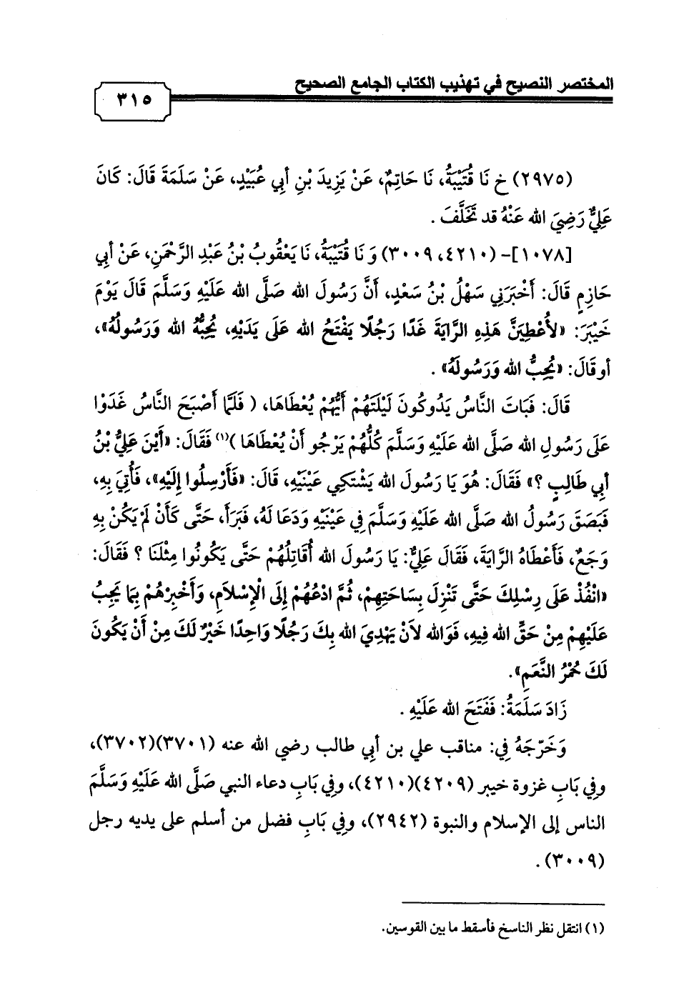 (2975) خ نَا قُتَيْبَةُ, نَا حَاتِمٌ, عَنْ يَزِيدَ بْنِ أبِي عُبَيْدٍ, عَنْ سَلَمَةَ قَالَ: كَانَ عَلِيٌّ رَضِيَ الله عَنْهُ قد تَخَلَّفَ.