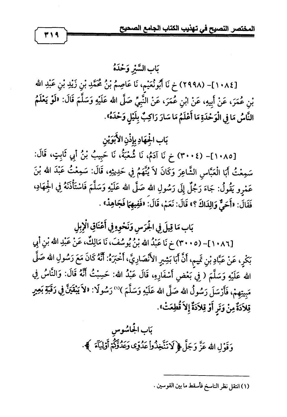 [1084]- (2998) خ نَا أَبُونُعَيْمٍ, نَا عَاصِمُ بْنُ مُحَمَّدِ بْنِ زَيْدِ بْنِ عَبْدِ الله بْنِ عُمَرَ, عَنْ أَبِيهِ, عَنْ ابْنِ عُمَرَ, عَنْ النَّبِيِّ صَلَّى الله عَلَيْهِ وَسَلَّمَ قَالَ: «لَوْ يَعْلَمُ النَّاسُ مَا فِي الْوَحْدَةِ مَا أَعْلَمُ مَا سَارَ رَاكِبٌ بِلَيْلٍ وَحْدَهُ».