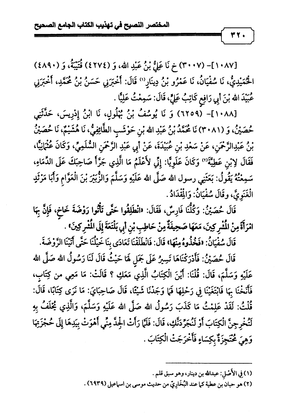 [1088]- (6259) وَنَا يُوسُفُ بْنُ بُهْلُولٍ, نَا ابْنُ إِدْرِيسَ, حَدَّثَنِي حُصَيْنُ، وَ (3081) نَا مُحَمَّدُ بْنُ عَبْدِ الله بْنِ حَوْشَبٍ الطَّائِفِيُّ, نَا هُشَيْمٌ, نَا حُصَيْنُ بْنُ عَبْدِالرَّحْمَنِ, عَنْ سَعْدِ بْنِ عُبَيْدَةَ, عَنْ أبِي عَبْدِ الرَّحْمَنِ السُّلَمِيِّ، وَكَانَ عُثْمَانِيًّا, فَقَالَ لِابْنِ عَطِيَّةَ (¬2) وَكَانَ عَلَوِيًّا: إِنِّي لأَعْلَمُ مَا الَّذِي جَرَّأَ صَاحِبَكَ عَلَى الدِّمَاءِ, سَمِعْتُهُ يَقُولُ: بَعَثَنِي رسول الله صَلَّى الله عَلَيْهِ وَسَلَّمَ وَالزُّبَيْرَ بْنَ الْعَوَّامِ وَأَبَا مَرْثَدٍ الْغَنَوِيَّ, وقَالَ سُفْيَانُ: وَالْمِقْدَادُ.