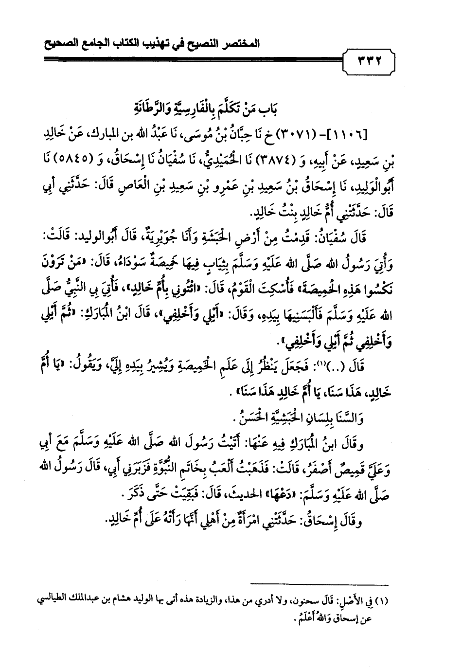 [1106]- (3071) خ نَا حِبَّانُ بْنُ مُوسَى, نَا عَبْدُ الله بن المبارك, عَنْ خَالِدِ بْنِ سَعِيدٍ, عَنْ أَبِيهِ, وَ (3874) نَا الْحُمَيْدِيُّ, نَا سُفْيَانُ نَا إِسْحَاقُ، وَ (5845) نَا أَبُوالْوَلِيدِ, نَا إِسْحَاقُ بْنُ سَعِيدِ بْنِ عَمْرِو بْنِ سَعِيدِ بْنِ الْعَاصِ قَالَ: حَدَّثَنِي أبِي قَالَ: حَدَّثَتْنِي أُمُّ خَالِدٍ بِنْتُ خَالِدٍ.