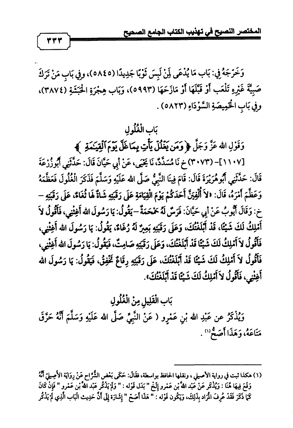 [1107]- (3073) خ نَا مُسَدَّدٌ, نَا يَحْيَى, عَنْ أبِي حَيَّانَ قَالَ: حَدَّثَنِي أَبُوزُرْعَةَ قَالَ: حَدَّثَنِي أَبُوهُرَيْرَةَ قَالَ: قَامَ فِينَا النَّبِيُّ صَلَّى الله عَلَيْهِ وَسَلَّمَ فَذَكَرَ الْغُلُولَ فَعَظَّمَهُ وَعَظَّمَ أَمْرَهُ, قَالَ: «لاَ أُلْفِيَنَّ أَحَدَكُمْ يَوْمَ الْقِيَامَةِ عَلَى رَقَبَتِهِ شَاةٌ لَهَا ثُغَاءٌ, عَلَى رَقَبَتِهِ - خ: وَقَالَ أَيُّوبُ عَنْ أبِي حَيَّانَ: فَرَسٌ لَهُ حَمْحَمَةٌ - يَقُولُ: يَا رَسُولَ الله أَغِثْنِي, فَأَقُولُ لاَ أَمْلِكُ لَكَ شَيْئًا, قَدْ أَبْلَغْتُكَ, وَعَلَى رَقَبَتِهِ بَعِيرٌ لَهُ رُغَاءٌ, يَقُولُ: يَا رَسُولَ الله أَغِثْنِي, فَأَقُولُ لاَ أَمْلِكُ لَكَ شَيْئًا قَدْ أَبْلَغْتُكَ, وَعَلَى رَقَبَتِهِ صَامِتٌ, فَيَقُولُ: يَا رَسُولَ الله أَغِثْنِي, فَأَقُولُ لاَ أَمْلِكُ لَكَ شَيْئًا قَدْ أَبْلَغْتُكَ, عَلَى رَقَبَتِهِ رِقَاعٌ تَخْفِقُ, فَيَقُولُ: يَا رَسُولَ الله أَغِثْنِي, فَأَقُولُ لاَ أَمْلِكُ لَكَ شَيْئًا قَدْ أَبْلَغْتُكَ».
