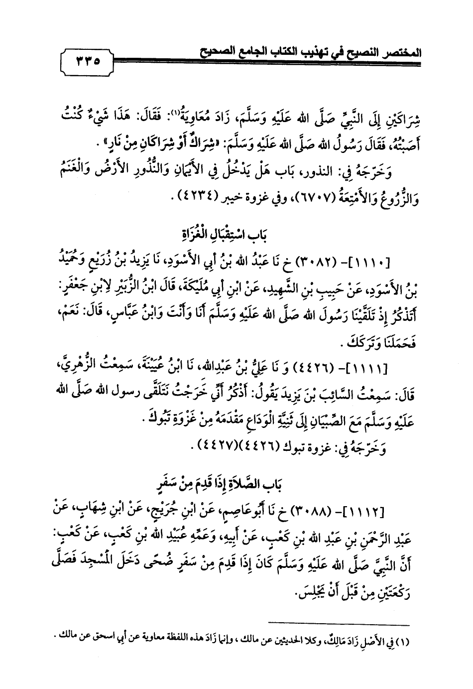 (¬1) فِي الأَصْلِ زَادَ مَالِكٌ، وكلا الحديثين عن مالك، وإنما زَادَ هذه اللفظة معاوية عن أبِي اسحق عن مالك.