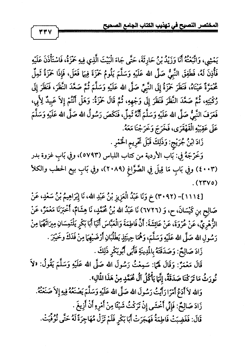 يَمْشِي, وَاتَّبَعْتُهُ أَنَا وَزَيْدُ بْنُ حَارِثَةَ, حَتَّى جَاءَ الْبَيْتَ الَّذِي فِيهِ حَمْزَةُ, فَاسْتَأْذَنَ عَلَيْهِ فَأُذِنَ لَهُ, فَطَفِقَ النَّبِيُّ صَلَّى الله عَلَيْهِ وَسَلَّمَ يَلُومُ حَمْزَةَ فِيمَا فَعَلَ, فَإِذَا حَمْزَةُ ثَمِلٌ مُحْمَرَّةٌ عَيْنَاهُ, فَنَظَرَ حَمْزَةُ إِلَى النَّبِيِّ صَلَّى الله عَلَيْهِ وَسَلَّمَ ثُمَّ صَعَّدَ النَّظَرَ, فَنَظَرَ إِلَى رُكْبَتِهِ, ثُمَّ صَعَّدَ النَّظَرَ فَنَظَرَ إِلَى وَجْهِهِ, ثُمَّ قَالَ حَمْزَةُ: وَهَلْ أَنْتُمْ إِلاَ عَبِيدٌ لِأَبِي, فَعَرَفَ النَّبِيُّ صَلَّى الله عَلَيْهِ وَسَلَّمَ أَنَّهُ ثَمِلٌ, فَنَكَصَ رَسُولُ الله صَلَّى الله عَلَيْهِ وَسَلَّمَ عَلَى عَقِبَيْهِ الْقَهْقَرَى, فَخَرَجَ وَخَرَجْنَا مَعَهُ.