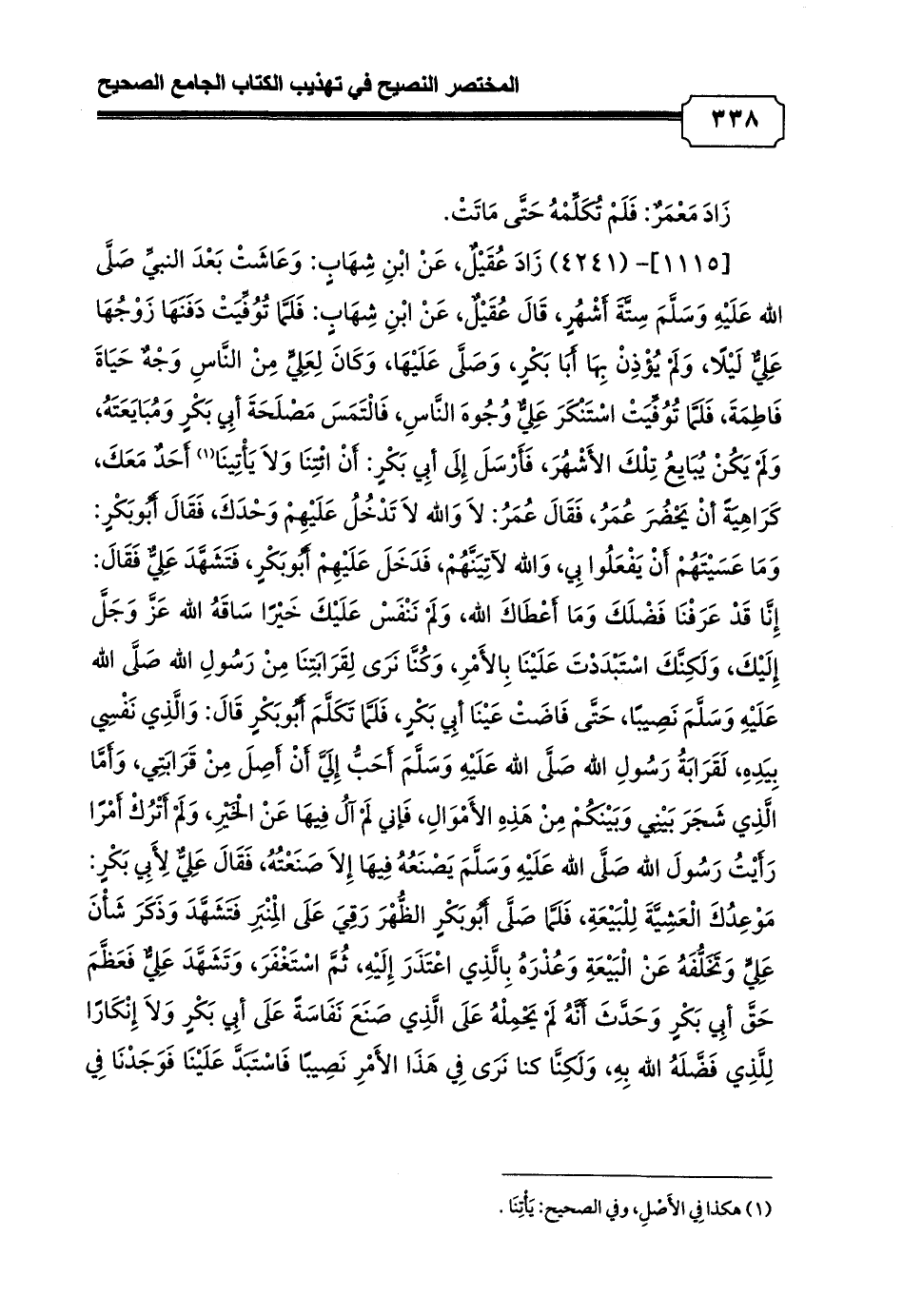 [1115]- (4241) زَادَ عُقَيْلٌ, عَنْ ابْنِ شِهَابٍ: وَعَاشَتْ بَعْدَ النبيِّ صَلَّى الله عَلَيْهِ وَسَلَّمَ سِتَّةَ أَشْهُرٍ، قَالَ عُقَيْلٌ, عَنْ ابْنِ شِهَابٍ: فَلَمَّا تُوُفِّيَتْ دَفَنَهَا زَوْجُهَا عَلِيٌّ لَيْلًا, وَلَمْ يُؤْذِنْ بِهَا أَبَا بَكْرٍ, وَصَلَّى عَلَيْهَا, وَكَانَ لِعَلِيٍّ مِنْ النَّاسِ وَجْهٌ حَيَاةَ فَاطِمَةَ, فَلَمَّا تُوُفِّيَتْ اسْتَنْكَرَ عَلِيٌّ وُجُوهَ النَّاسِ, فَالْتَمَسَ مَصْلَحَةَ أبِي بَكْرٍ وَمُبَايَعَتَهُ, وَلَمْ يَكُنْ يُبَايِعُ تِلْكَ الأَشْهُرَ, فَأَرْسَلَ إِلَى أبِي بَكْرٍ: أَنْ ائْتِنَا وَلاَ يَأْتِينَا (¬1) أَحَدٌ مَعَكَ, كَرَاهِيَةً أنْ يَحْضُرَ عُمَرُ، فَقَالَ عُمَرُ: لاَ وَالله لاَ تَدْخُلُ عَلَيْهِمْ وَحْدَكَ, فَقَالَ أَبُوبَكْرٍ: وَمَا عَسَيْتَهُمْ أَنْ يَفْعَلُوا بِي, وَالله لآتِيَنَّهُمْ, فَدَخَلَ عَلَيْهِمْ أَبُوبَكْرٍ, فَتَشَهَّدَ عَلِيٌّ فَقَالَ: إِنَّا قَدْ عَرَفْنَا فَضْلَكَ وَمَا أَعْطَاكَ الله, وَلَمْ نَنْفَسْ عَلَيْكَ خَيْرًا سَاقَهُ الله عَزَّ وَجَلَّ إِلَيْكَ, وَلَكِنَّكَ اسْتَبْدَدْتَ عَلَيْنَا بِالأَمْرِ, وَكُنَّا نَرَى لِقَرَابَتِنَا مِنْ رَسُولِ الله صَلَّى الله عَلَيْهِ وَسَلَّمَ نَصِيبًا, حَتَّى فَاضَتْ عَيْنَا أبِي بَكْرٍ, فَلَمَّا تَكَلَّمَ أَبُوبَكْرٍ قَالَ: وَالَّذِي نَفْسِي بِيَدِهِ, لَقَرَابَةُ رَسُولِ الله صَلَّى الله عَلَيْهِ وَسَلَّمَ أَحَبُّ إِلَيَّ أَنْ أَصِلَ مِنْ قَرَابَتِي, وَأَمَّا الَّذِي شَجَرَ بَيْنِي وَبَيْنَكُمْ مِنْ هَذِهِ الأَمْوَالِ, فَإني لَمْ آلُ فِيهَا عَنْ الْخَيْرِ, وَلَمْ أَتْرُكْ أَمْرًا رَأَيْتُ رَسُولَ الله صَلَّى الله عَلَيْهِ وَسَلَّمَ يَصْنَعُهُ فِيهَا إِلاَ صَنَعْتُهُ, فَقَالَ عَلِيٌّ لِأَبِي بَكْرٍ: مَوْعِدُكَ الْعَشِيَّةَ لِلْبَيْعَةِ, فَلَمَّا صَلَّى أَبُوبَكْرٍ الظُّهْرَ رَقِيَ عَلَى الْمِنْبَرِ فَتَشَهَّدَ وَذَكَرَ شَأْنَ عَلِيٍّ وَتَخَلُّفَهُ عَنْ الْبَيْعَةِ وَعُذْرَهُ بِالَّذِي اعْتَذَرَ إِلَيْهِ, ثُمَّ اسْتَغْفَرَ, وَتَشَهَّدَ عَلِيٌّ فَعَظَّمَ حَقَّ أبِي بَكْرٍ وَحَدَّثَ أَنَّهُ لَمْ يَحْمِلْهُ عَلَى الَّذِي صَنَعَ نَفَاسَةً عَلَى أبِي بَكْرٍ وَلاَ إِنْكَارًا لِلَّذِي فَضَّلَهُ الله بِهِ, وَلَكِنَّا كنا نَرَى فِي هَذَا الأَمْرِ نَصِيبًا فَاسْتَبَدَّ عَلَيْنَا فَوَجَدْنَا فِي