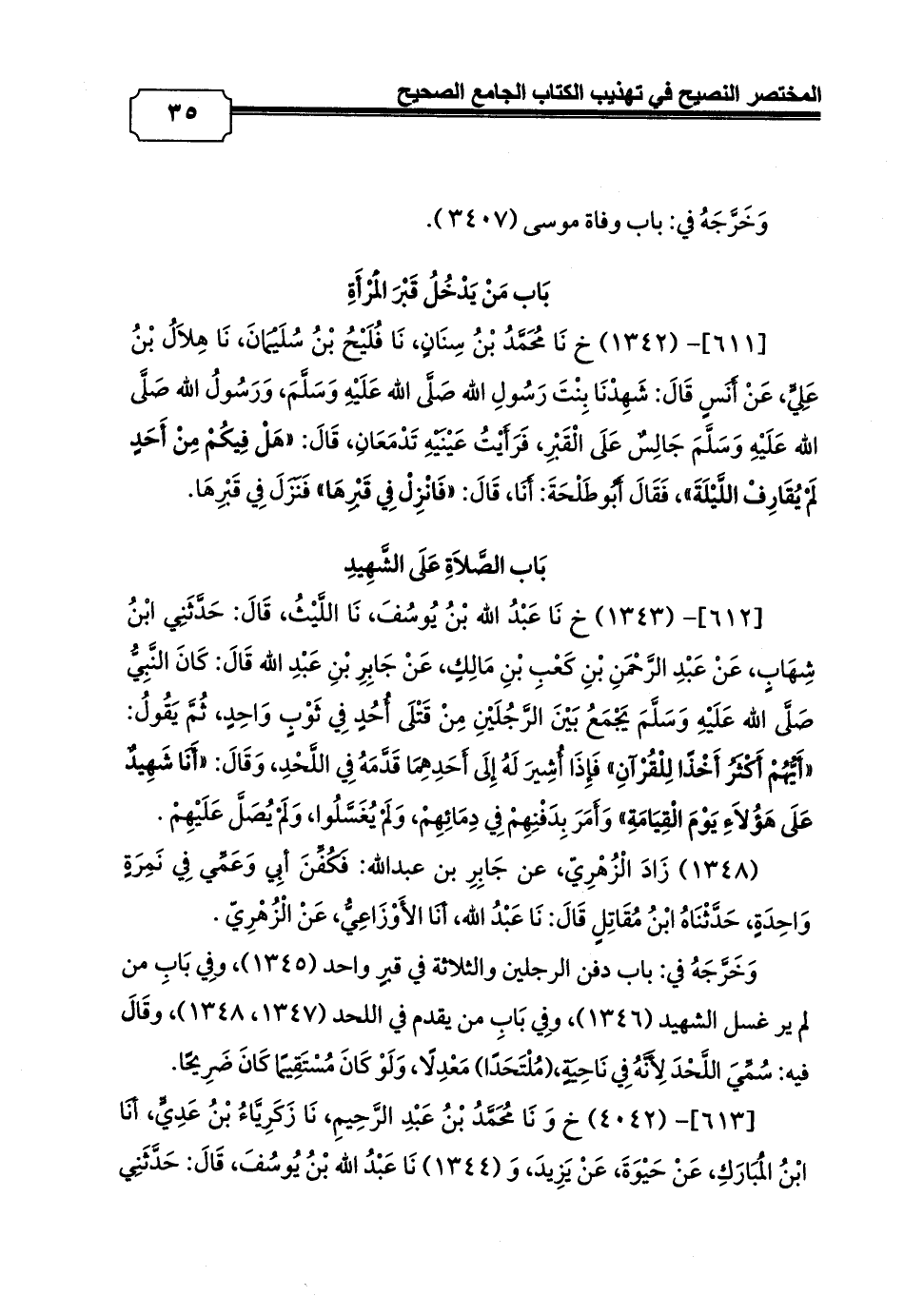 [612]- (1343) خ نَا عَبْدُ الله بْنُ يُوسُفَ، نَا اللَّيْثُ، قَالَ: حَدَّثَنِي ابْنُ شِهَابٍ، عَنْ عَبْدِ الرَّحْمَنِ بْنِ كَعْبِ بْنِ مَالِكٍ، عَنْ جَابِرِ بْنِ عَبْدِ الله قَالَ: كَانَ النَّبِيُّ صَلَّى الله عَلَيْهِ وَسَلَّمَ يَجْمَعُ بَيْنَ الرَّجُلَيْنِ مِنْ قَتْلَى أُحُدٍ فِي ثَوْبٍ وَاحِدٍ، ثُمَّ يَقُولُ: «أَيُّهُمْ أَكْثَرُ أَخْذًا لِلْقُرْآنِ» فَإِذَا أُشِيرَ لَهُ إِلَى أَحَدِهِمَا قَدَّمَهُ فِي اللَّحْدِ, وَقَالَ: «أَنَا شَهِيدٌ عَلَى هَؤُلاَءِ يَوْمَ الْقِيَامَةِ» وَأَمَرَ بِدَفْنِهِمْ فِي دِمَائِهِمْ, وَلَمْ يُغَسَّلُوا, وَلَمْ يُصَلَّ عَلَيْهِمْ.