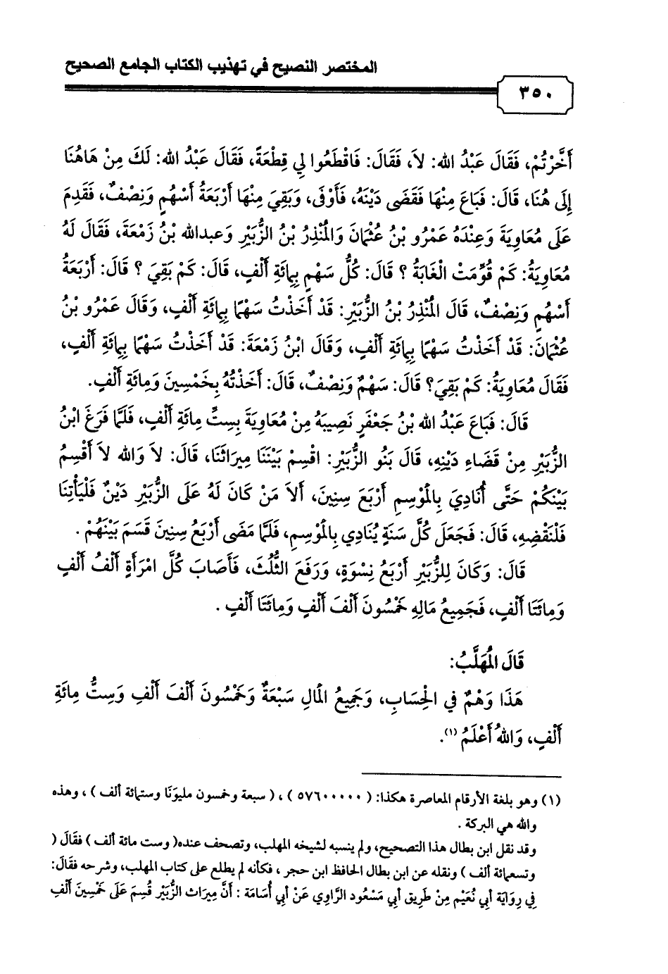 وقد نقل ابن بطال هذا التصحيح، ولم ينسبه لشيخه المهلب، وتصحف عنده (وست مائة ألف) فقَالَ (وتسعمائة ألف) ونقله عن ابن بطال الحافظ ابن حجر، فكأنه لم يطلع على كتاب المهلب، وشرحه فقَالَ: فِي رِوَايَة أبِي نُعَيْم مِنْ طَرِيق أبِي مَسْعُود الرَّاوِي عَنْ أبِي أُسَامَة: أَنَّ مِيرَاث الزُّبَيْر قُسِمَ عَلَى خَمْسِينَ أَلْفِ أَلْفِ وَمِائَتَيْ أَلْفِ وَنَيِّف، زَادَ عَلَى رِوَايَة إِسْحَاق وَنَيِّف، وَفِيهِ نَظَر لِأَنَّهُ إِذَا كَانَ لِكُلِّ زَوْجَة أَلْف أَلْف وَمِائَتَا أَلْف فَنَصِيب الأَرْبَع أَرْبَعَة آلاَف أَلْف وَثَمَانمِائَةِ أَلْف (1200000×4 = 4800000)، وَهَذَا هُوَ الثَّمَن، وَيَرْتَفِع مَنْ ضَرَبَهُ فِي ثَمَانِيَة (4800000× 8= 38400000)، ثَلاَثُونَ أَلْف أَلْف وَأَرْبَعمِائَةِ أَلْف (بل يرتفع إلى: ثمانية وثَلاَثِينَ أَلْف أَلْف وأربعمائة ألف) وَهَذَا الْقَدْر هُوَ الثُّلُثَانِ، فَإِذَا ضُمَّ إِلَيْهِ الثُّلُث الْمُوصَى بِهِ وَهُوَ قَدْر نِصْف الثُّلُثَيْنِ، وَجُمْلَته تِسْعَة عَشَرَ أَلْف أَلْف وَمِائَتَا أَلْف (19200000) كَانَ جُمْلَة مَالِهِ عَلَى هَذَا: سَبْعَة وَخَمْسِينَ أَلْف أَلْف وَسِتّمِائَةِ أَلْف.