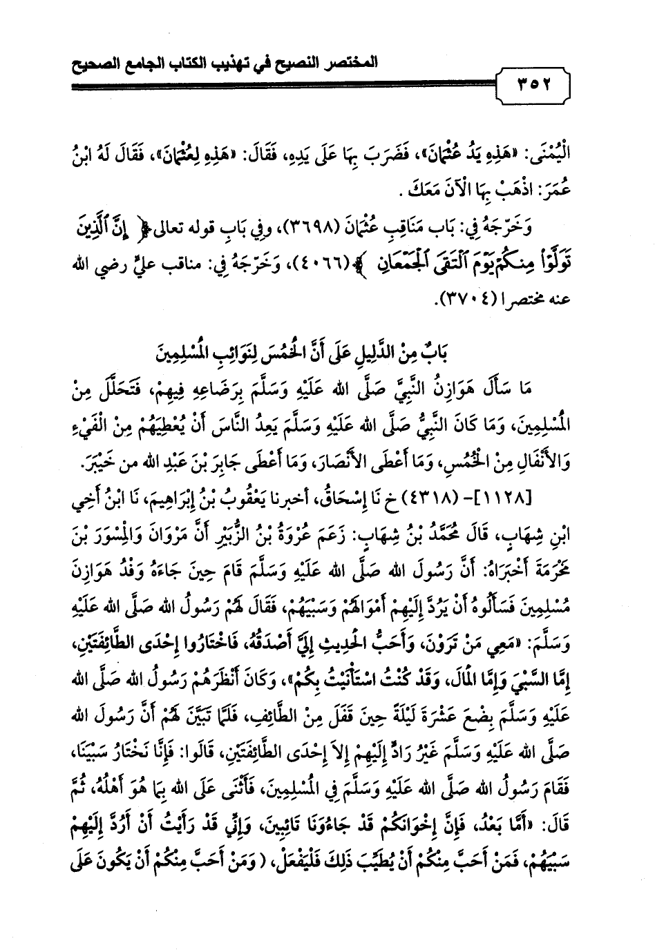 [1128]- (4318) خ نَا إِسْحَاقُ, أخبرنا يَعْقُوبُ بْنُ إِبْرَاهِيمَ, نَا ابْنُ أَخِي ابْنِ شِهَابٍ, قَالَ مُحَمَّدُ بْنُ شِهَابٍ: زَعَمَ عُرْوَةُ بْنُ الزُّبَيْرِ أَنَّ مَرْوَانَ وَالْمِسْوَرَ بْنَ مَخْرَمَةَ أَخْبَرَاهُ: أَنَّ رَسُولَ الله صَلَّى الله عَلَيْهِ وَسَلَّمَ قَامَ حِينَ جَاءَهُ وَفْدُ هَوَازِنَ مُسْلِمِينَ فَسَأَلُوهُ أَنْ يَرُدَّ إِلَيْهِمْ أَمْوَالَهُمْ وَسَبْيَهُمْ, فَقَالَ لَهُمْ رَسُولُ الله صَلَّى الله عَلَيْهِ وَسَلَّمَ: «مَعِي مَنْ تَرَوْنَ, وَأَحَبُّ الْحَدِيثِ إِلَيَّ أَصْدَقُهُ, فَاخْتَارُوا إِحْدَى الطَّائِفَتَيْنِ, إِمَّا السَّبْيَ وَإِمَّا الْمَالَ, وَقَدْ كُنْتُ اسْتَأْنَيْتُ بِكُمْ»، وَكَانَ أَنْظَرَهُمْ رَسُولُ الله صَلَّى الله عَلَيْهِ وَسَلَّمَ بِضْعَ عَشْرَةَ لَيْلَةً حِينَ قَفَلَ مِنْ الطَّائِفِ, فَلَمَّا تَبَيَّنَ لَهُمْ أَنَّ رَسُولَ الله صَلَّى الله عَلَيْهِ وَسَلَّمَ غَيْرُ رَادٍّ إِلَيْهِمْ إِلاَ إِحْدَى الطَّائِفَتَيْنِ, قَالَوا: فَإِنَّا نَخْتَارُ سَبْيَنَا, فَقَامَ رَسُولُ الله صَلَّى الله عَلَيْهِ وَسَلَّمَ فِي الْمُسْلِمِينَ, فَأَثْنَى عَلَى الله بِمَا هُوَ أَهْلُهُ, ثُمَّ قَالَ: «أَمَّا بَعْدُ, فَإِنَّ إِخْوَانَكُمْ قَدْ جَاءُوَنَا تَائِبِينَ, وَإِنِّي قَدْ رَأَيْتُ أَنْ أَرُدَّ إِلَيْهِمْ سَبْيَهُمْ, فَمَنْ أَحَبَّ مِنْكُمْ أَنْ يُطَيِّبَ ذَلِكَ فَلْيَفْعَلْ, (وَمَنْ أَحَبَّ مِنْكُمْ أَنْ يَكُونَ عَلَى