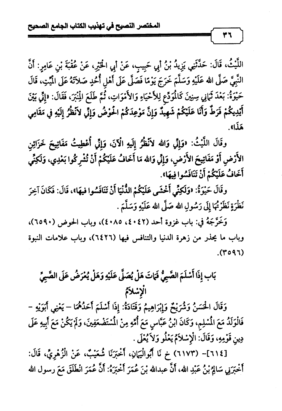 اللَّيْثُ، قَالَ: حَدَّثَنِي يَزِيدُ بْنُ أبِي حَبِيبٍ، عَنْ أبِي الْخَيْرِ، عَنْ عُقْبَةَ بْنِ عَامِرٍ: أَنَّ النَّبِيَّ صَلَّى الله عَلَيْهِ وَسَلَّمَ خَرَجَ يَوْمًا فَصَلَّى عَلَى أَهْلِ أُحُدٍ صَلاَتَهُ عَلَى الْمَيِّتِ, قَالَ حَيْوَةُ: بَعْدَ ثَمَانِي سِنِينَ كَالْمُوَدِّعِ لِلأَحْيَاءِ وَالأَمْوَاتِ، ثُمَّ طَلَعَ الْمِنْبَرَ، فَقَالَ: «إِنِّي بَيْنَ أَيْدِيكُمْ فَرَطٌ وَأَنَا عَلَيْكُمْ شَهِيدٌ وَإِنَّ مَوْعِدَكُمْ الْحَوْضُ وَإِنِّي لاَنْظُرُ إِلَيْهِ في مَقَامِي هَذَا».