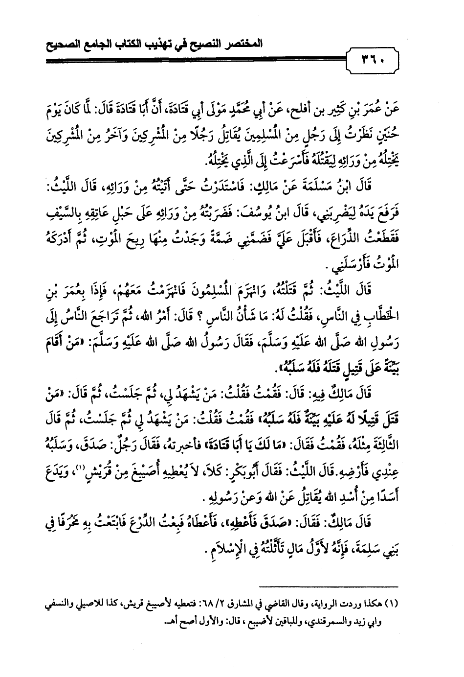قَالَ مَالِكٌ فِيهِ: قَالَ: فَقُمْتُ فَقُلْتُ: مَنْ يَشْهَدُ لِي, ثُمَّ جَلَسْتُ, ثُمَّ قَالَ: «مَنْ قَتَلَ قَتِيلًا لَهُ عَلَيْهِ بَيِّنَةٌ فَلَهُ سَلَبُهُ» فَقُمْتُ فَقُلْتُ: مَنْ يَشْهَدُ لِي ثُمَّ جَلَسْتُ, ثُمَّ قَالَ الثَّالِثَةَ مِثْلَهُ, فَقُمْتُ فَقَالَ: «مَا لَكَ يَا أَبَا قَتَادَةَ» فأخبرتهُ، فَقَالَ رَجُلٌ: صَدَقَ, وَسَلَبُهُ عِنْدِي فَأَرْضِهِ. قَالَ اللَّيْثُ: فَقَالَ أَبُوبَكْرٍ: كَلاَ, لاَ يُعْطِيهِ أُصَيْبِغَ مِنْ قُرَيْشٍ (¬1) , وَيَدَعَ أَسَدًا مِنْ أُسْدِ الله يُقَاتِلُ عَنْ الله وَعنْ رَسُولِهِ.