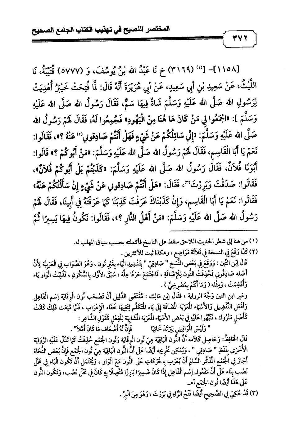 [1158]-[(¬1) (3169) خ نَا عَبْدُ الله بْنُ يُوسُفَ, وَ (5777) قُتَيْبَةُ, نَا اللَّيْثُ, عَنْ سَعِيدِ بْنِ أبِي سَعِيدٍ, عَنْ أبِي هُرَيْرَةَ أَنَّهُ قَالَ: لَمَّا فُتِحَتْ خَيْبَرُ أُهْدِيَتْ لِرَسُولِ الله صَلَّى الله عَلَيْهِ وَسَلَّمَ شَاةٌ فِيهَا سَمٌّ, فَقَالَ رَسُولُ الله صَلَّى الله عَلَيْهِ وَسَلَّمَ]: «اجْمَعُوا لِي مَنْ كَانَ هَا هُنَا مِنْ الْيَهُودِ» فَجُمِعُوا لَهُ, فَقَالَ لَهُمْ رَسُولُ الله صَلَّى الله عَلَيْهِ وَسَلَّمَ: «إِنِّي سَائِلُكُمْ عَنْ شَيْءٍ فَهَلْ أَنْتُمْ صَادِقوني (¬2)
