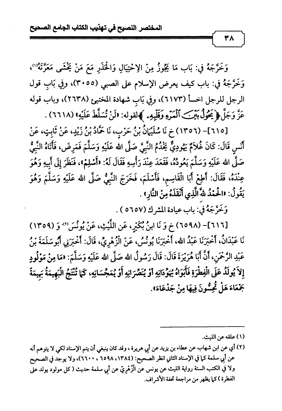 (¬2) أي عن ابن شهاب عن عطاء بن يزيد عن أبِي هريرة، وقد كان ينبغي أن يتم الإسناد لكي لا يتوهم أنه عن أبِي سلمة كما في الإسناد الثاني انظر الصحيح: (1384، 6598، 6600)، ولا يوجد في الصحيح ولا في الكتب الستة رواية الليث عن يونس عن الْزُهْرِيّ عن أبِي سلمة حديث (كل مولود يولد على الفطرة) كما يظهر من مراجعة تحفة الأشراف.