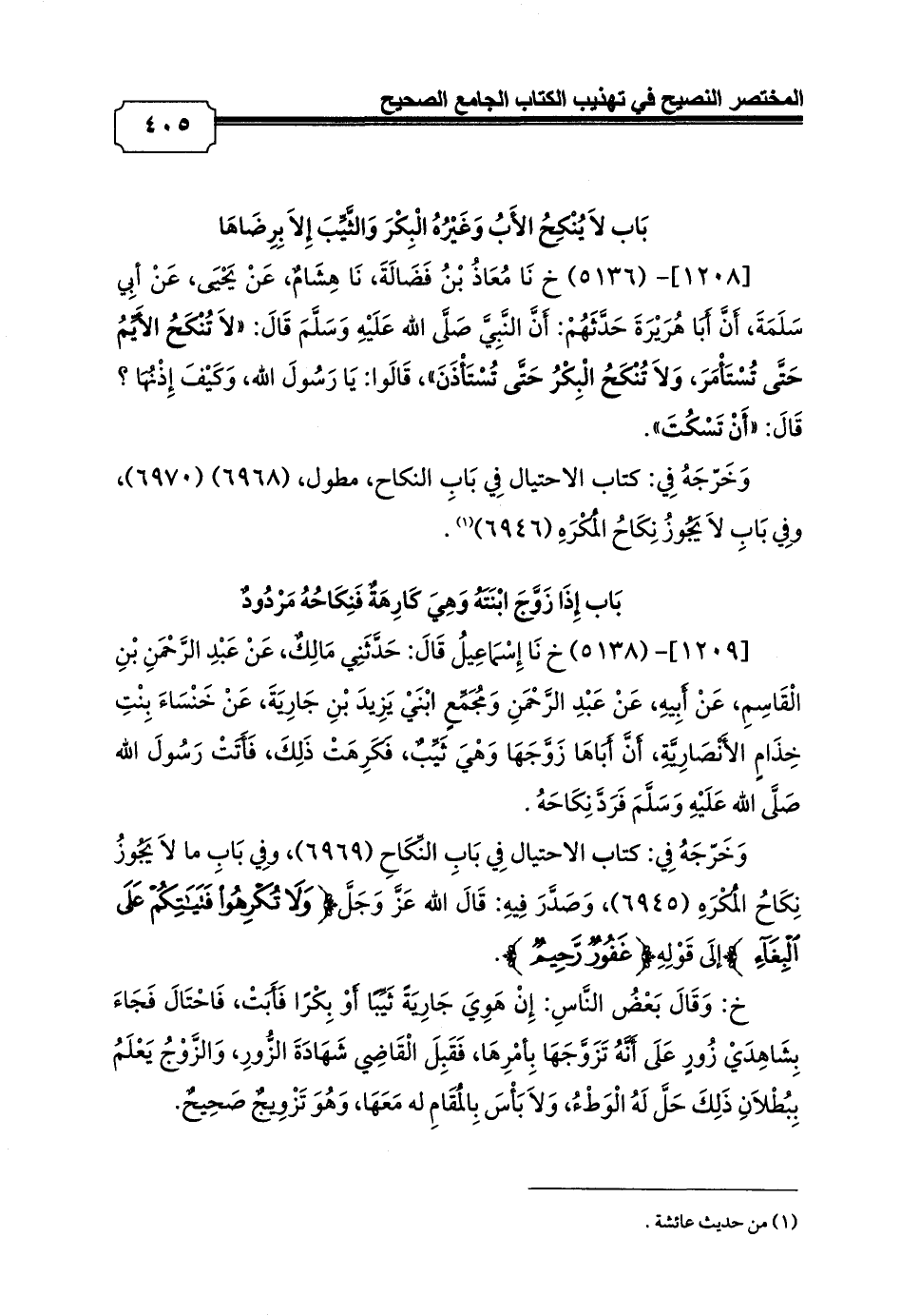 [1208]- (5136) خ نَا مُعَاذُ بْنُ فَضَالَةَ, نَا هِشَامٌ, عَنْ يَحْيَى, عَنْ أبِي سَلَمَةَ, أَنَّ أَبَا هُرَيْرَةَ حَدَّثَهُمْ: أَنَّ النَّبِيَّ صَلَّى الله عَلَيْهِ وَسَلَّمَ قَالَ: «لاَ تُنْكَحُ الأَيِّمُ حَتَّى تُسْتَأْمَرَ, وَلاَ تُنْكَحُ الْبِكْرُ حَتَّى تُسْتَأْذَنَ»، قَالَوا: يَا رَسُولَ الله, وَكَيْفَ إِذْنُهَا؟ قَالَ: «أَنْ تَسْكُتَ».