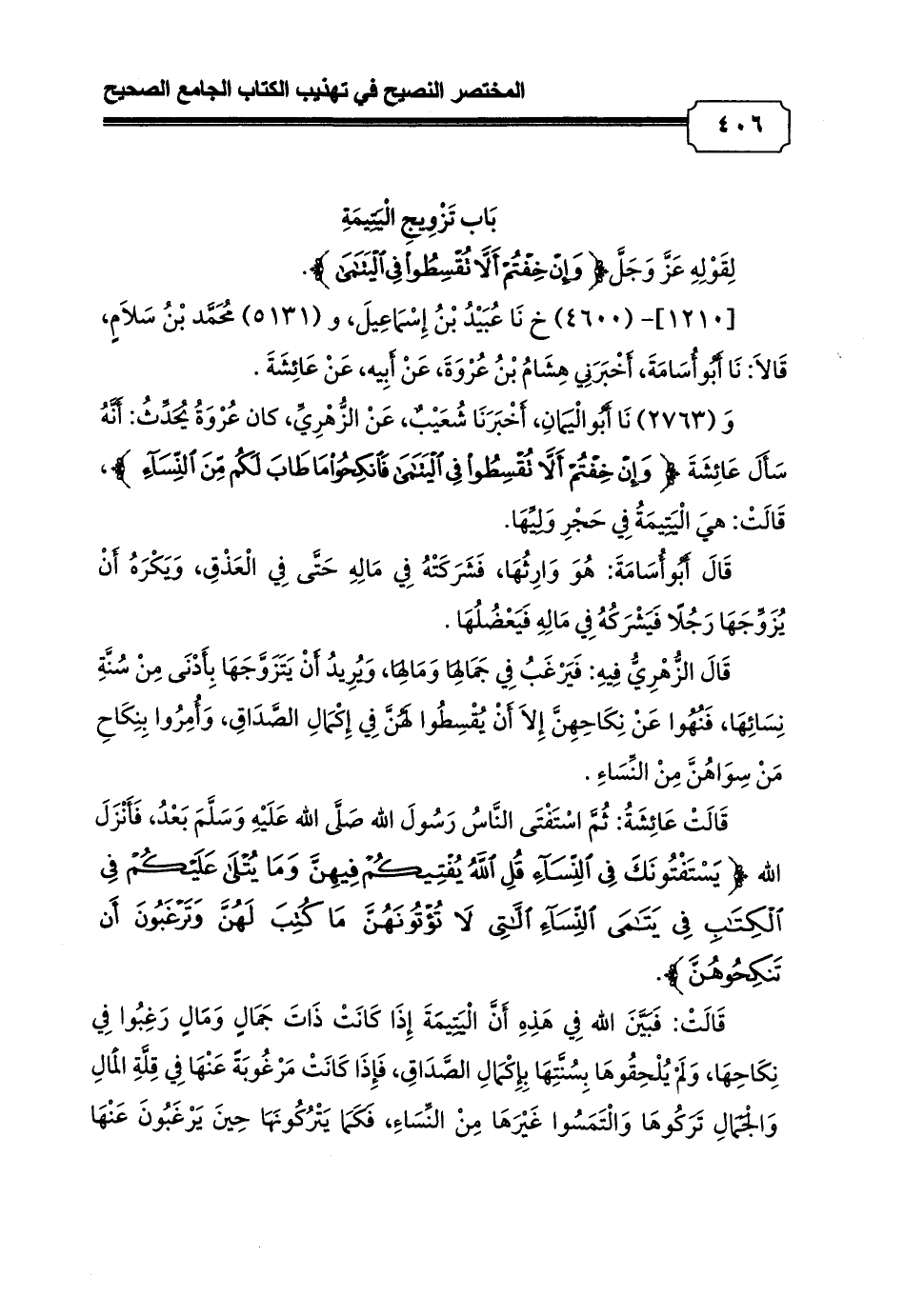وَ (2763) نَا أَبُوالْيَمَانِ، أَخْبَرَنَا شُعَيْبٌ، عَنْ الزُّهْرِيِّ، كان عُرْوَةُ يُحَدِّثُ: أَنَّهُ سَأَلَ عَائِشَةَ {وَإِنْ خِفْتُمْ أَلَّا تُقْسِطُوا فِي الْيَتَامَى فَانْكِحُوا مَا طَابَ لَكُمْ مِنَ النِّسَاءِ}، قَالَتْ: هيَ الْيَتِيمَةُ فِي حَجْرِ وَلِيِّهَا.