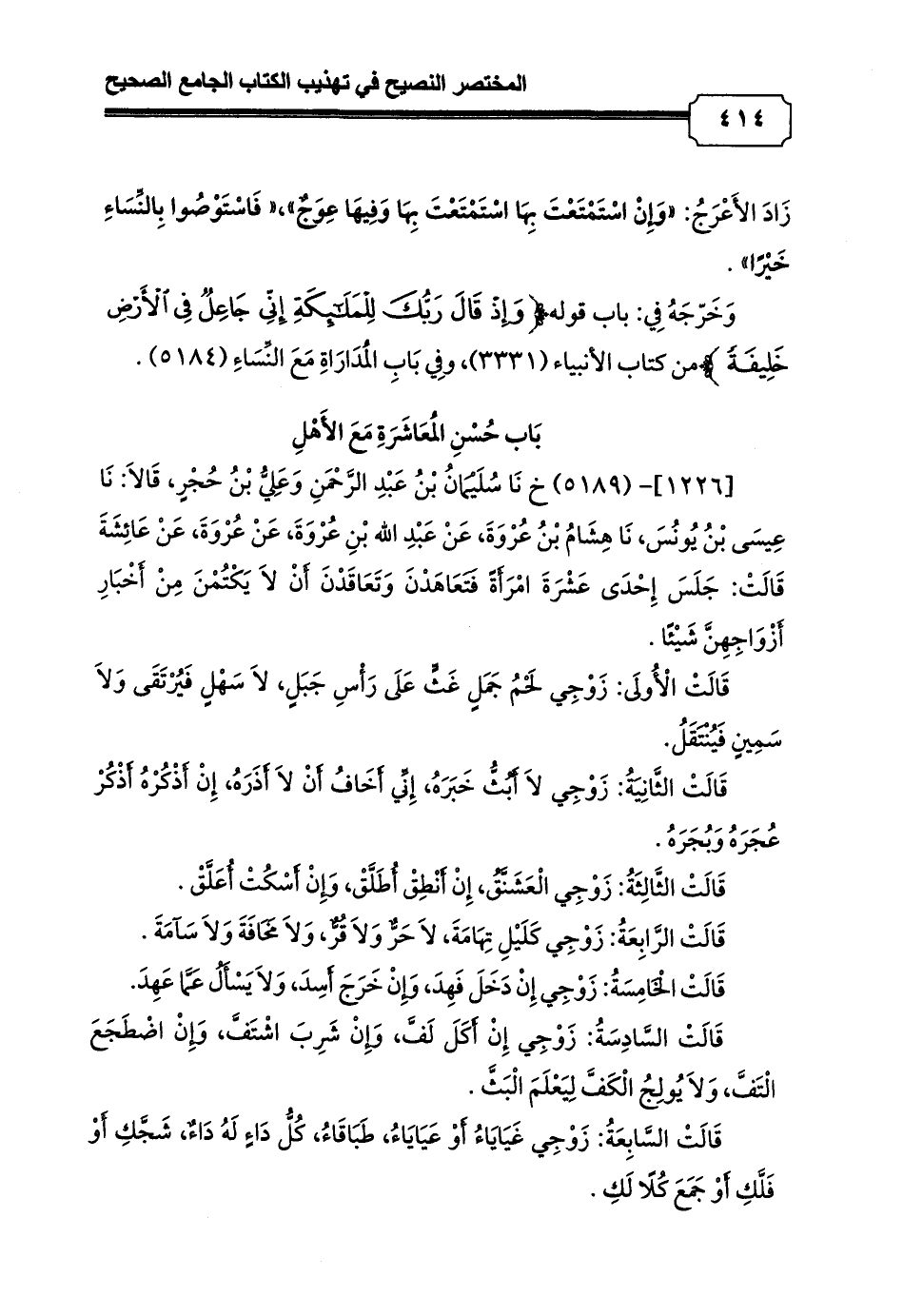 [1226]- (5189) خ نَا سُلَيْمَانُ بْنُ عَبْدِ الرَّحْمَنِ وَعَلِيُّ بْنُ حُجْرٍ، قَالاَ: نَا عِيسَى بْنُ يُونُسَ, نَا هِشَامُ بْنُ عُرْوَةَ, عَنْ عَبْدِ الله بْنِ عُرْوَةَ, عَنْ عُرْوَةَ, عَنْ عَائِشَةَ قَالَتْ: جَلَسَ إِحْدَى عَشْرَةَ امْرَأَةً فَتَعَاهَدْنَ وَتَعَاقَدْنَ أَنْ لاَ يَكْتُمْنَ مِنْ أَخْبَارِ أَزْوَاجِهِنَّ شَيْئًا.