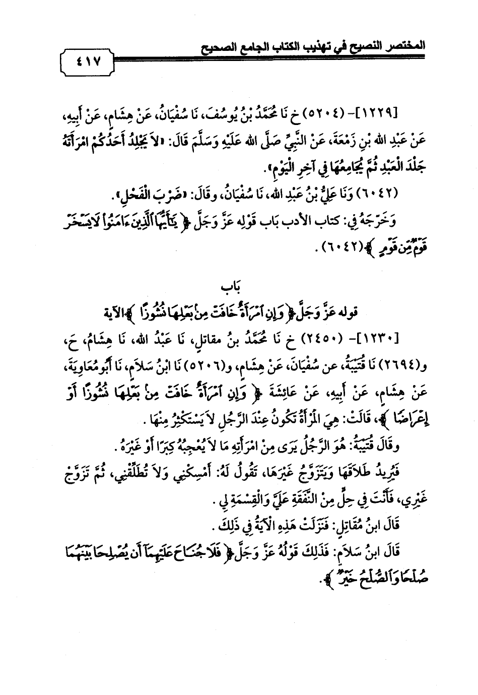 [1230]- (2450) خ نَا مُحَمَّدُ بنُ مقاتلٍ, نَا عَبْدُ الله, نَا هِشَامُ، حَ, و (2694) نَا قُتَيْبَةُ, عن سُفْيَانَ, عَنْ هِشَامٍ, و (5206) نَا ابْنُ سَلاَمٍ, نَا أَبُومُعَاوِيَةَ, عَنْ هِشَامٍ, عَنْ أَبِيهِ, عَنْ عَائِشَةَ {وَإِنِ امْرَأَةٌ خَافَتْ مِنْ بَعْلِهَا نُشُوزًا أَوْ إِعْرَاضًا} , قَالَتْ: هِيَ الْمَرْأَةُ تَكُونُ عِنْدَ الرَّجُلِ لاَ يَسْتَكْثِرُ مِنْهَا.