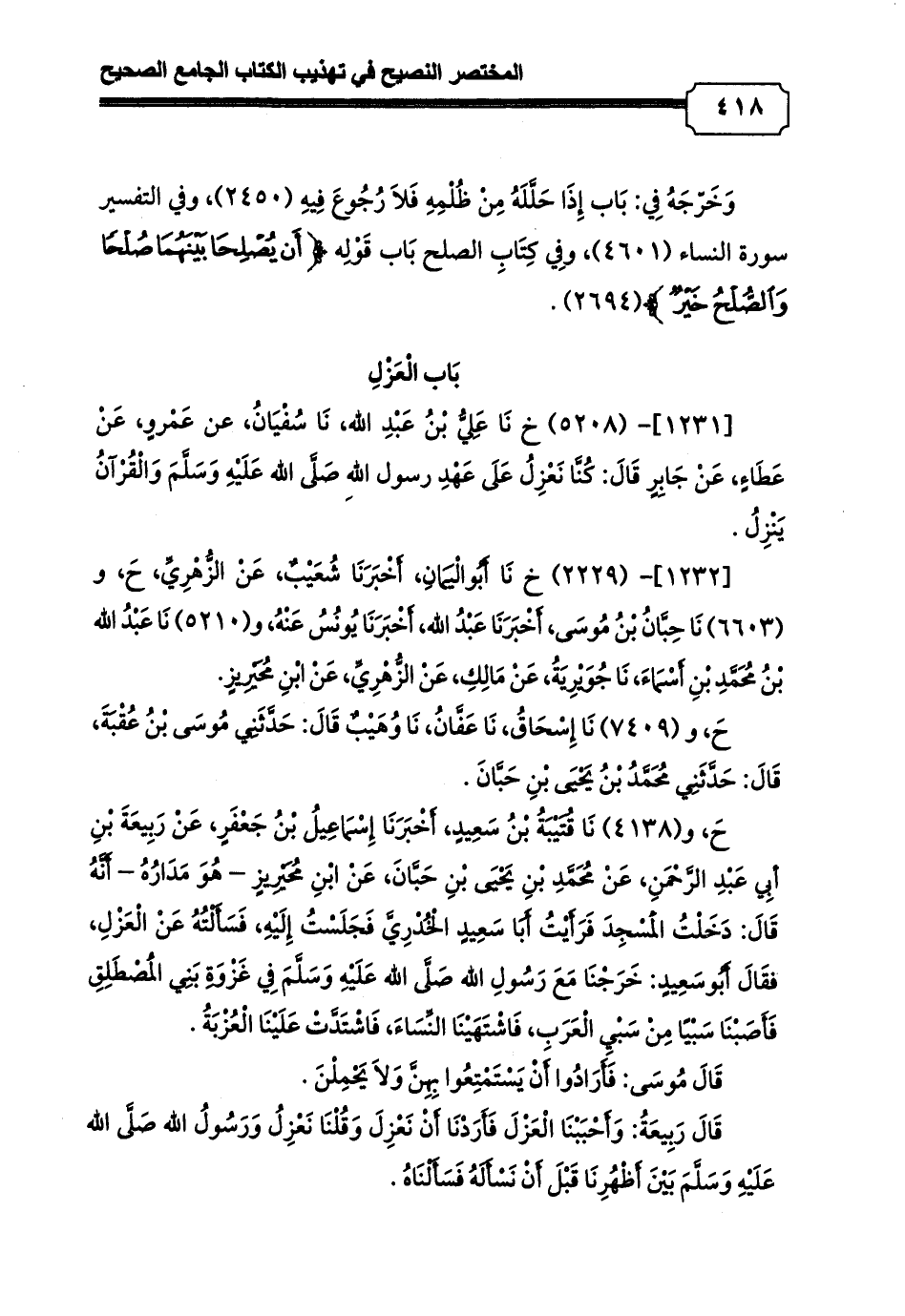 حَ, و (4138) نَا قُتَيْبَةُ بْنُ سَعِيدٍ, أَخْبَرَنَا إِسْمَاعِيلُ بْنُ جَعْفَرٍ, عَنْ رَبِيعَةَ بْنِ أبِي عَبْدِ الرَّحْمَنِ, عَنْ مُحَمَّدِ بْنِ يَحْيَى بْنِ حَبَّانَ, عَنْ ابْنِ مُحَيْرِيزٍ - هُوَ مَدَارُهُ - أَنَّهُ قَالَ: دَخَلْتُ الْمَسْجِدَ فَرَأَيْتُ أَبَا سَعِيدٍ الْخُدْرِيَّ فَجَلَسْتُ إِلَيْهِ, فَسَأَلْتُهُ عَنْ الْعَزْلِ, فقَالَ أَبُوسَعِيدٍ: خَرَجْنَا مَعَ رَسُولِ الله صَلَّى الله عَلَيْهِ وَسَلَّمَ فِي غَزْوَةِ بَنِي الْمُصْطَلِقِ فَأَصَبْنَا سَبْيًا مِنْ سَبْيِ الْعَرَبِ, فَاشْتَهَيْنَا النِّسَاءَ, فَاشْتَدَّتْ عَلَيْنَا الْعُزْبَةُ.